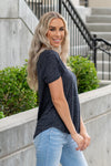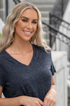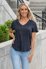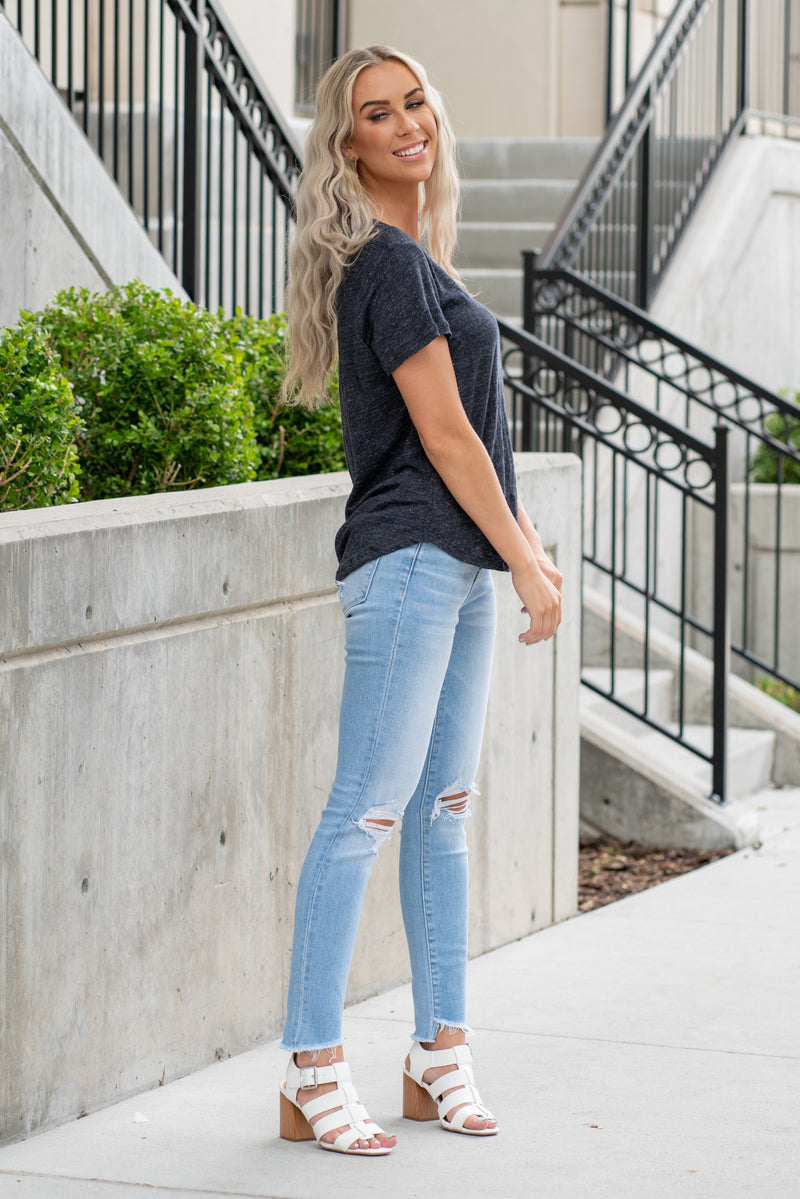 This isn't your basic v-neck tee. Made in a paper thin, soft fabric with a high low cut which it perfect for a little front tuck!