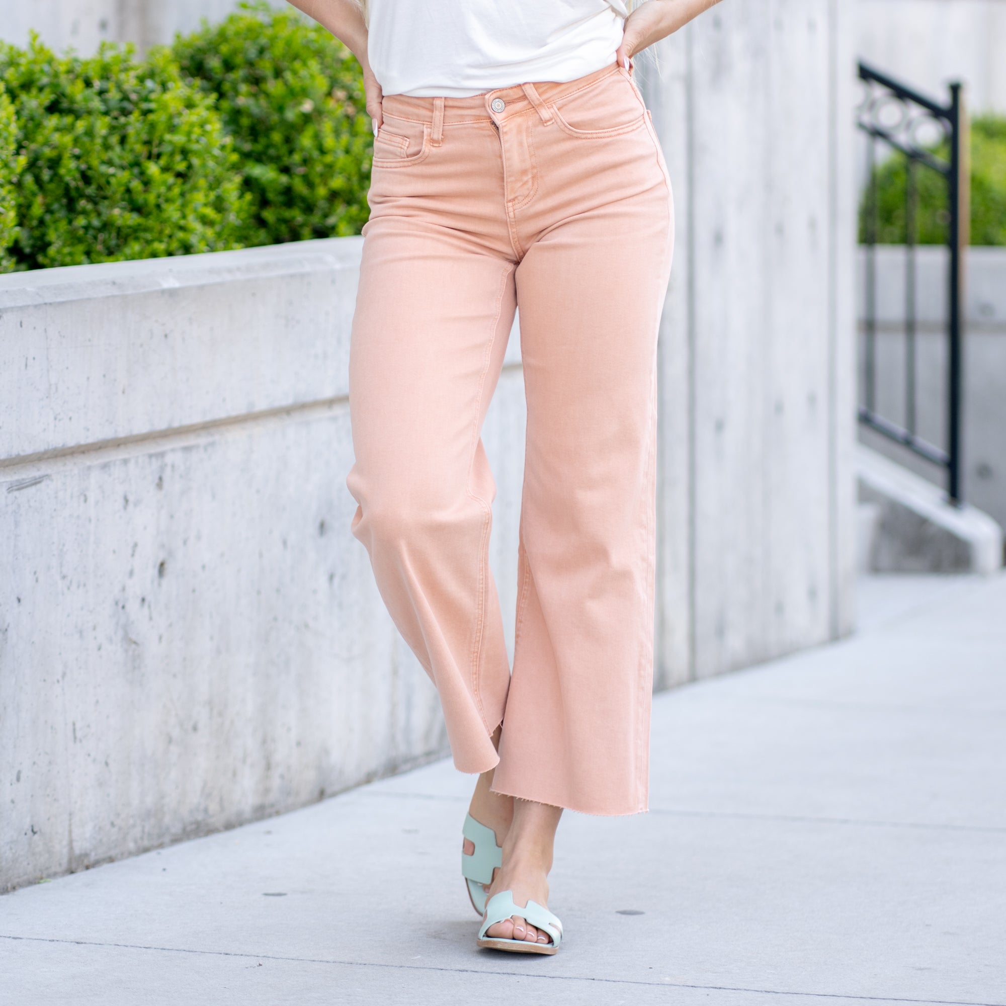 These High Rise Wide Leg Jeans bring effortless style with a modern edge. Designed with a flattering high rise waist and wide leg silhouette, they feature an ankle-length cut and a clean raw hem for that fresh, minimal look. Crafted from comfort stretch denim, they mold to your shape while keeping you comfy from day to night.