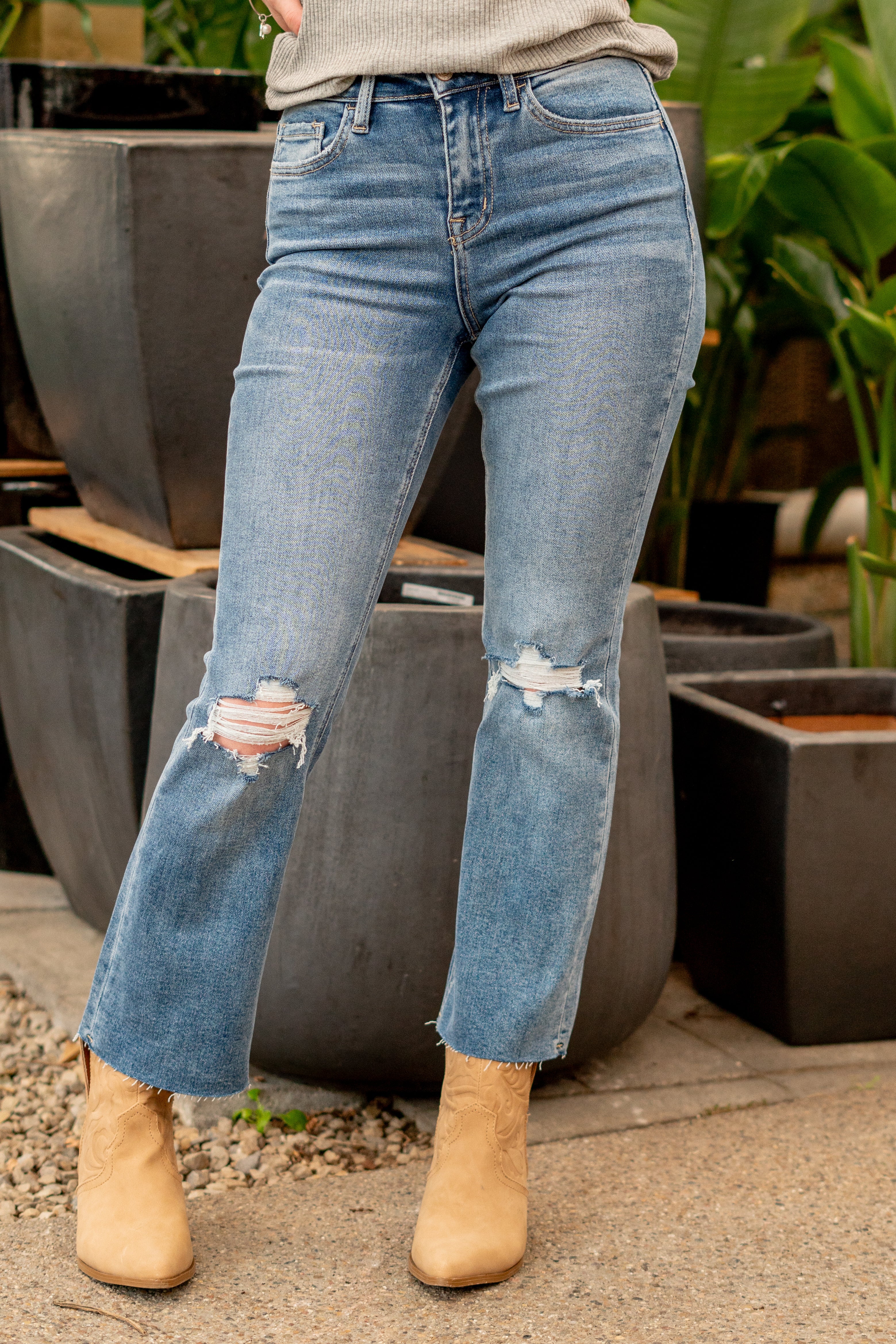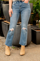Elevate your denim game with our High Rise Clean Cut Hem Crop Flare Jeans. Crafted from comfort stretch denim, these jeans hug your curves with a high-rise waist. The distressed details add a touch of casual charm, while the clean-cut raw hem brings a modern edge. With a cropped length and a chic flare silhouette, these jeans effortlessly combine comfort and contemporary style for a look that's both timeless and on-trend.
