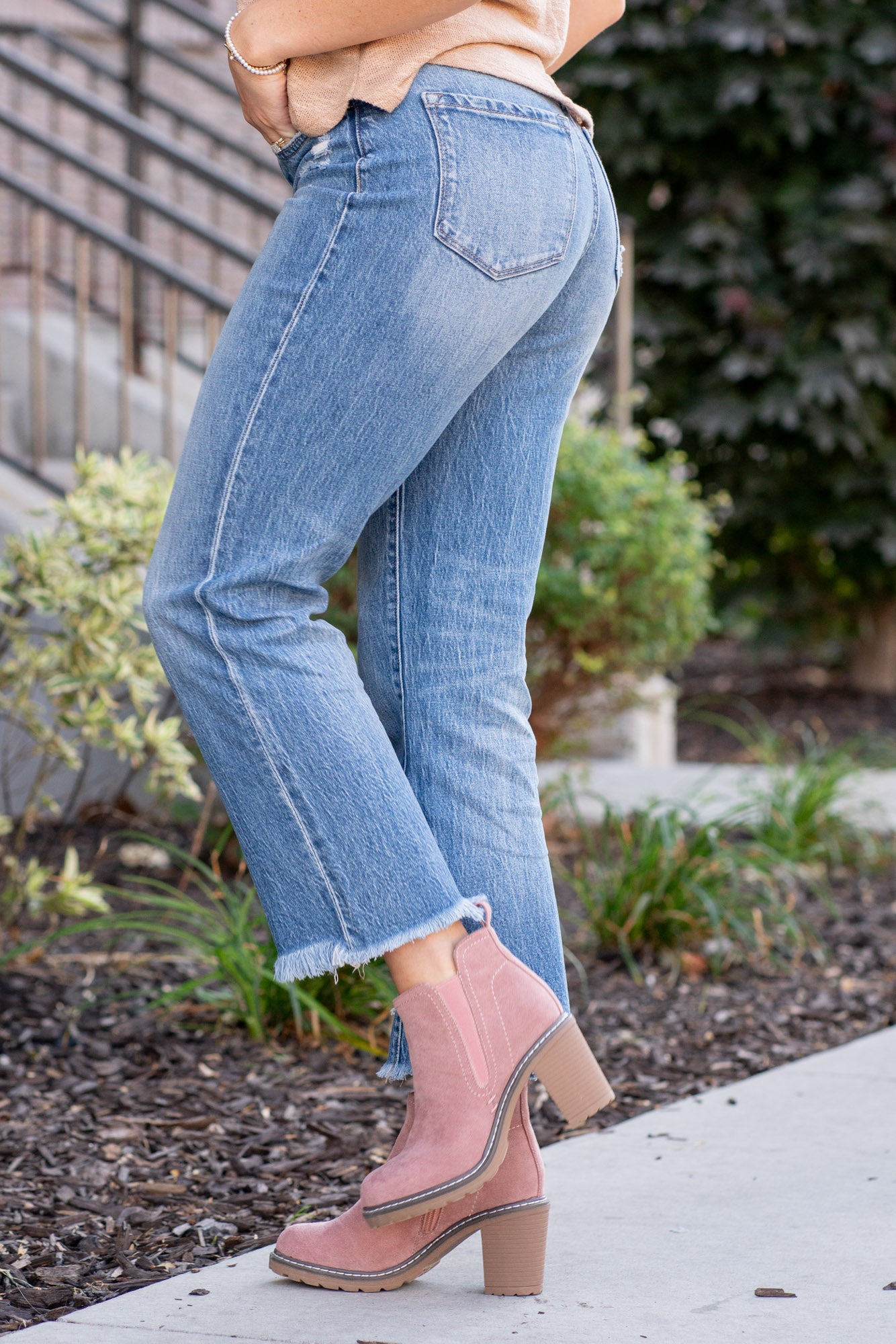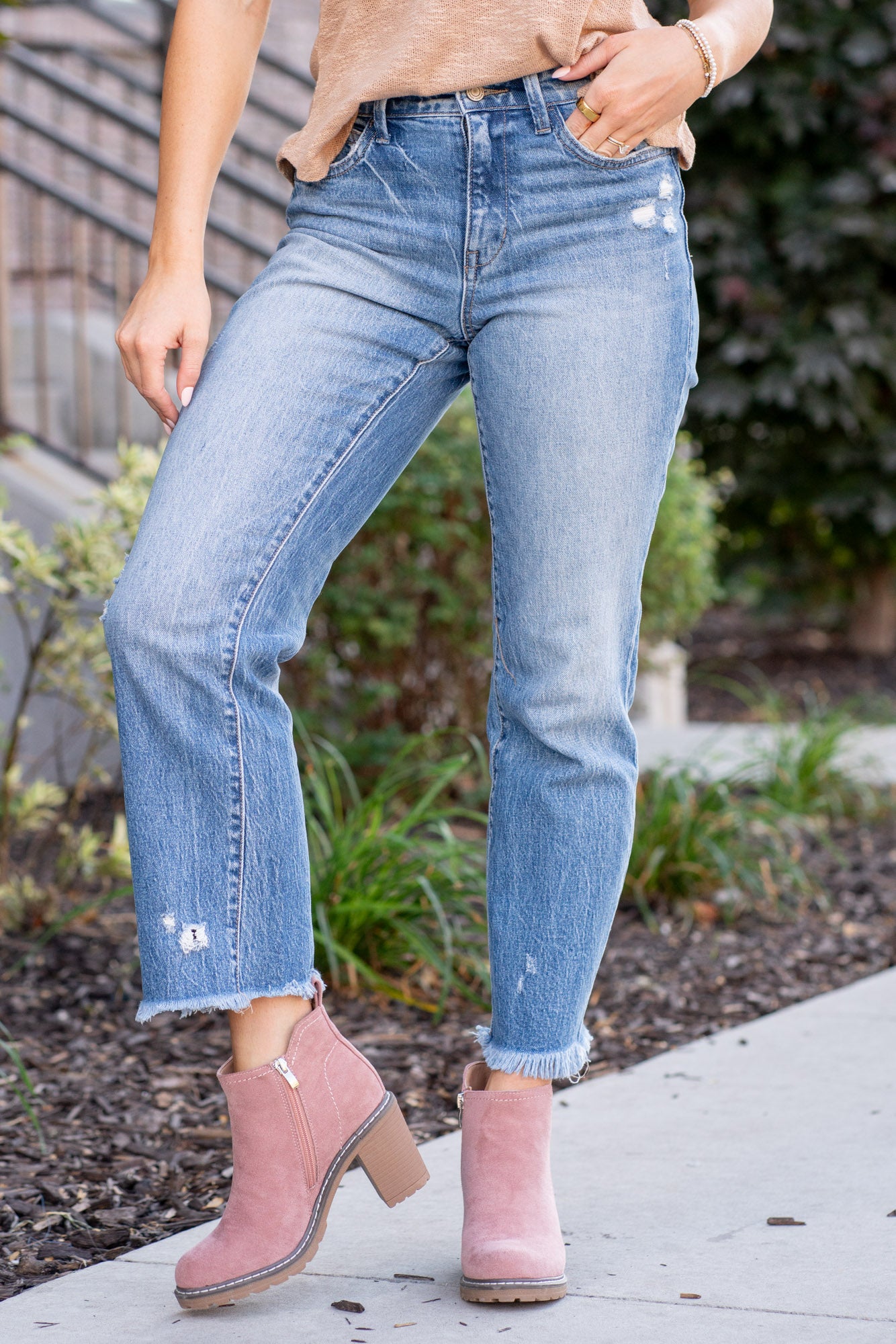 COMFORT STRETCH DENIM, HIGH RISE WAIST, DISTRESSED DETAIL, FRAYED HEM, CROPPED LENGTH, STRAIGHT JEANS