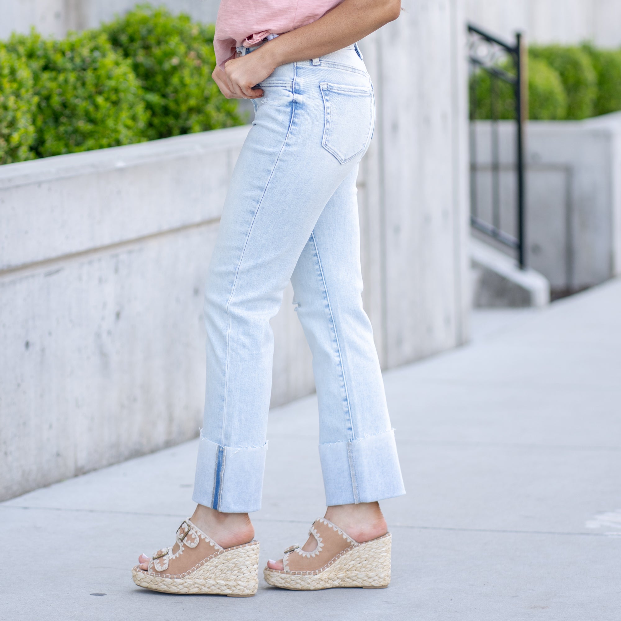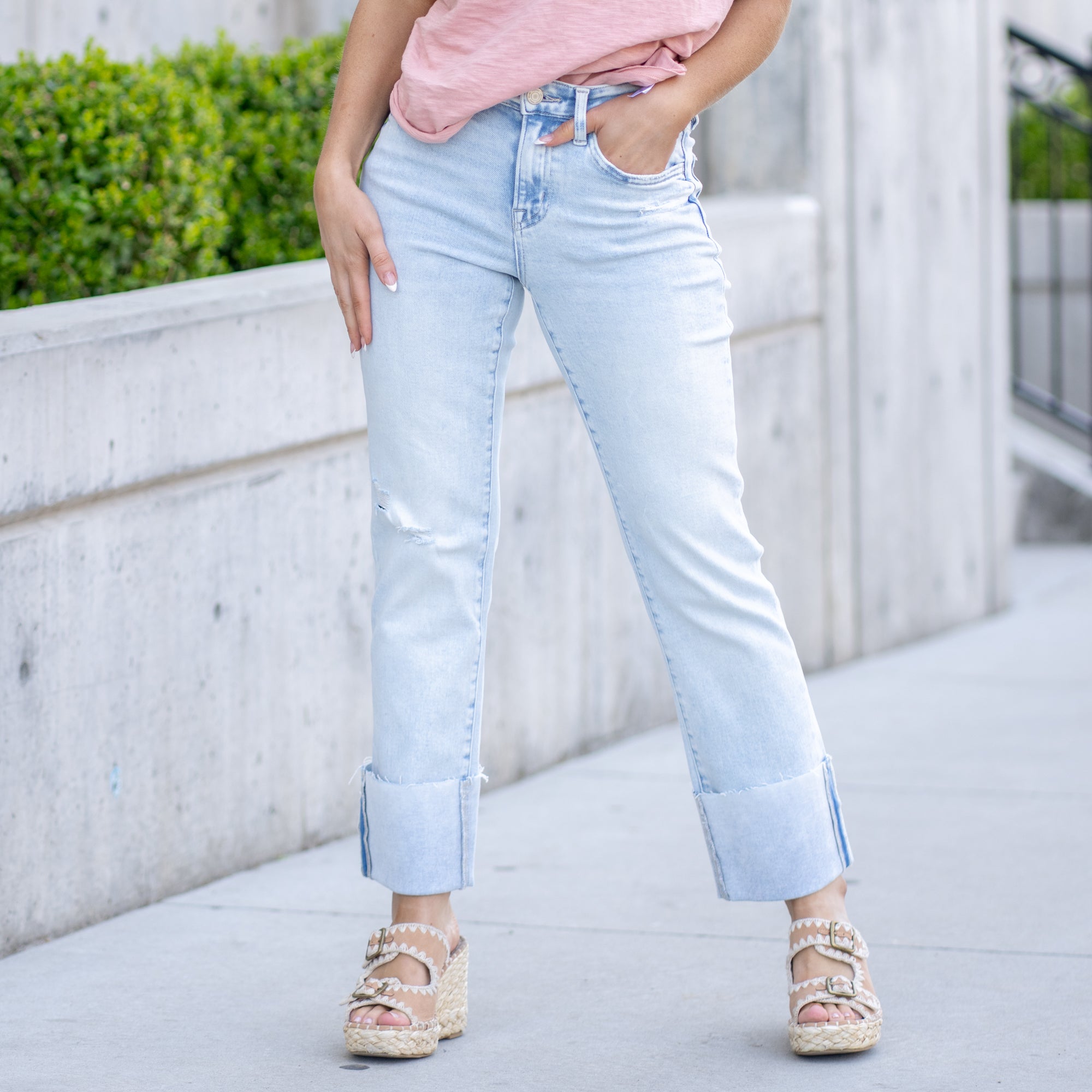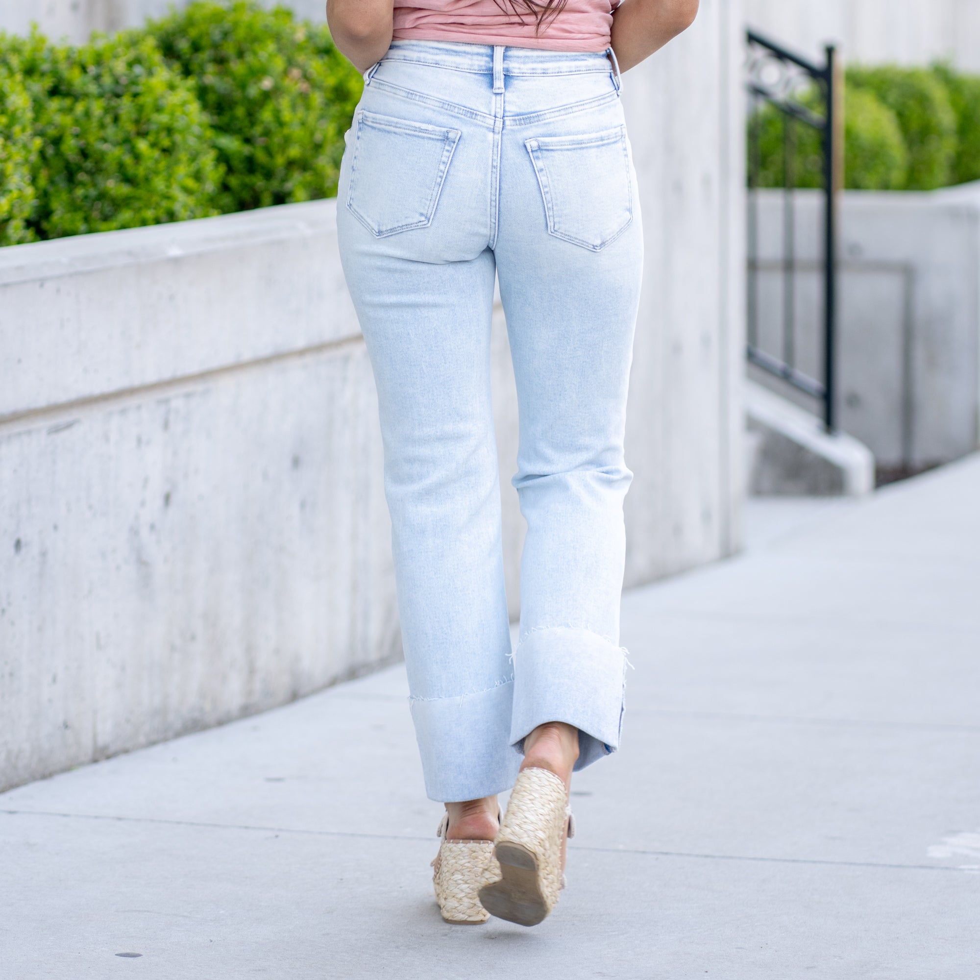 These High Rise Cuffed Crop Straight Jeans are your new go-to for laid-back edge. With a flattering high rise waist, comfort stretch denim, and a perfectly relaxed straight leg fit, they’re finished with light distressing and a single cuff hem for that effortless off-duty look. Cropped to pair perfectly with sneakers, sandals, or boots—these jeans are made for easy styling year-round.