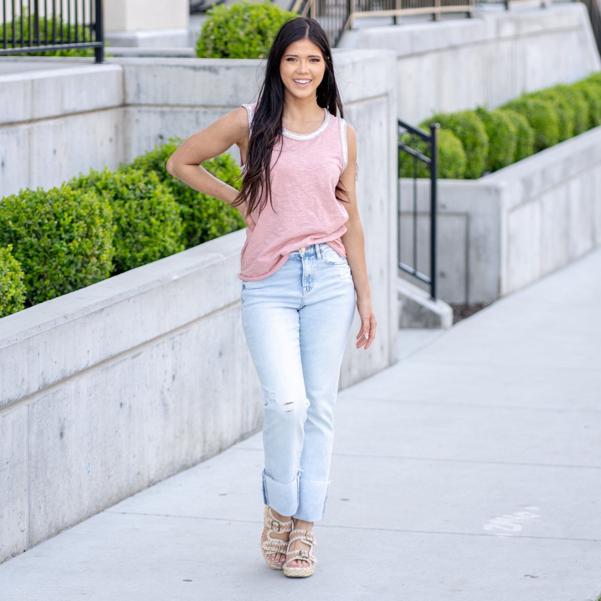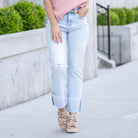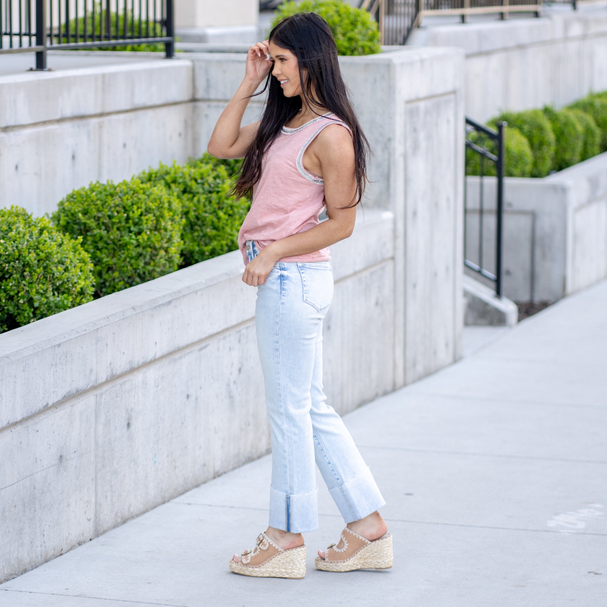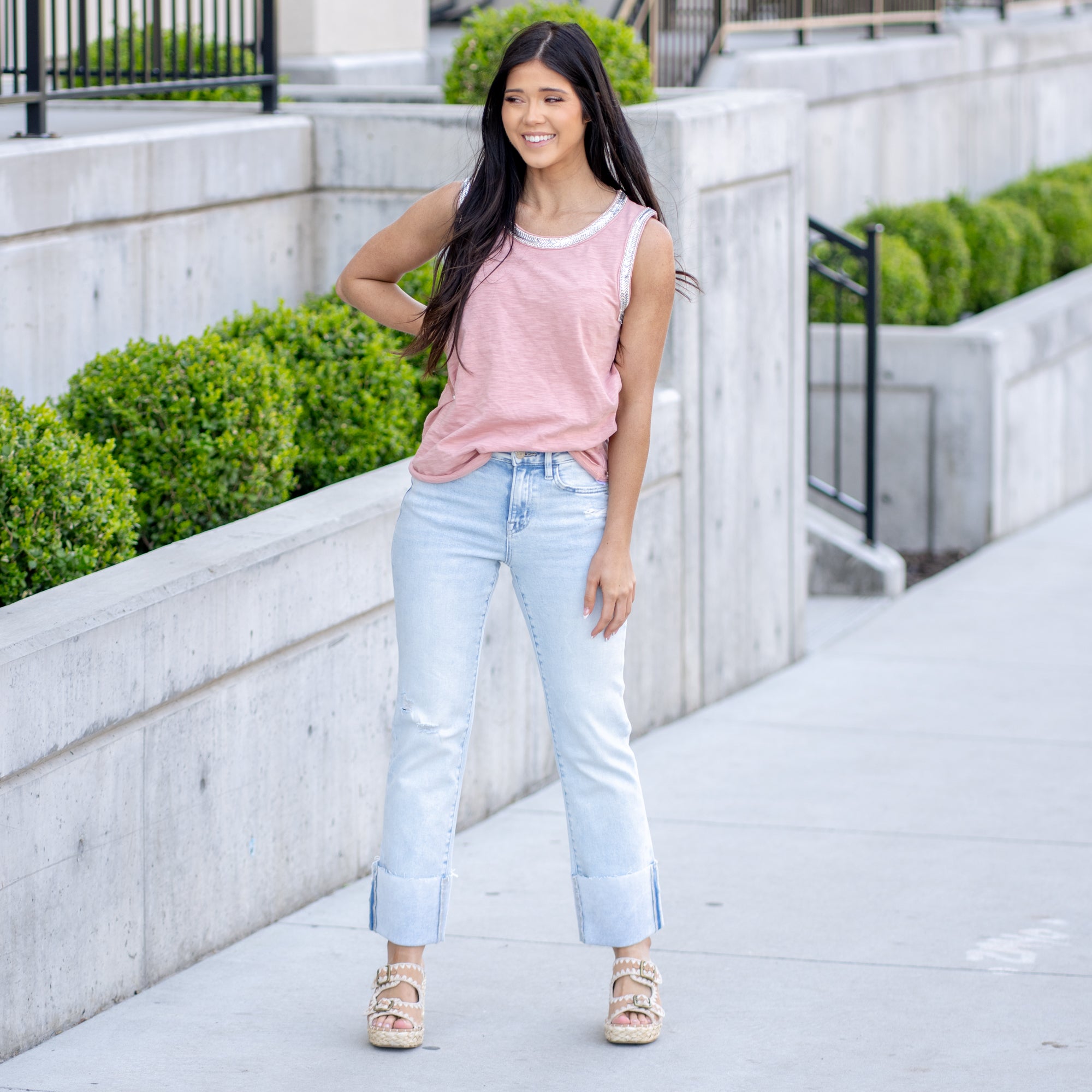 These High Rise Cuffed Crop Straight Jeans are your new go-to for laid-back edge. With a flattering high rise waist, comfort stretch denim, and a perfectly relaxed straight leg fit, they’re finished with light distressing and a single cuff hem for that effortless off-duty look. Cropped to pair perfectly with sneakers, sandals, or boots—these jeans are made for easy styling year-round.