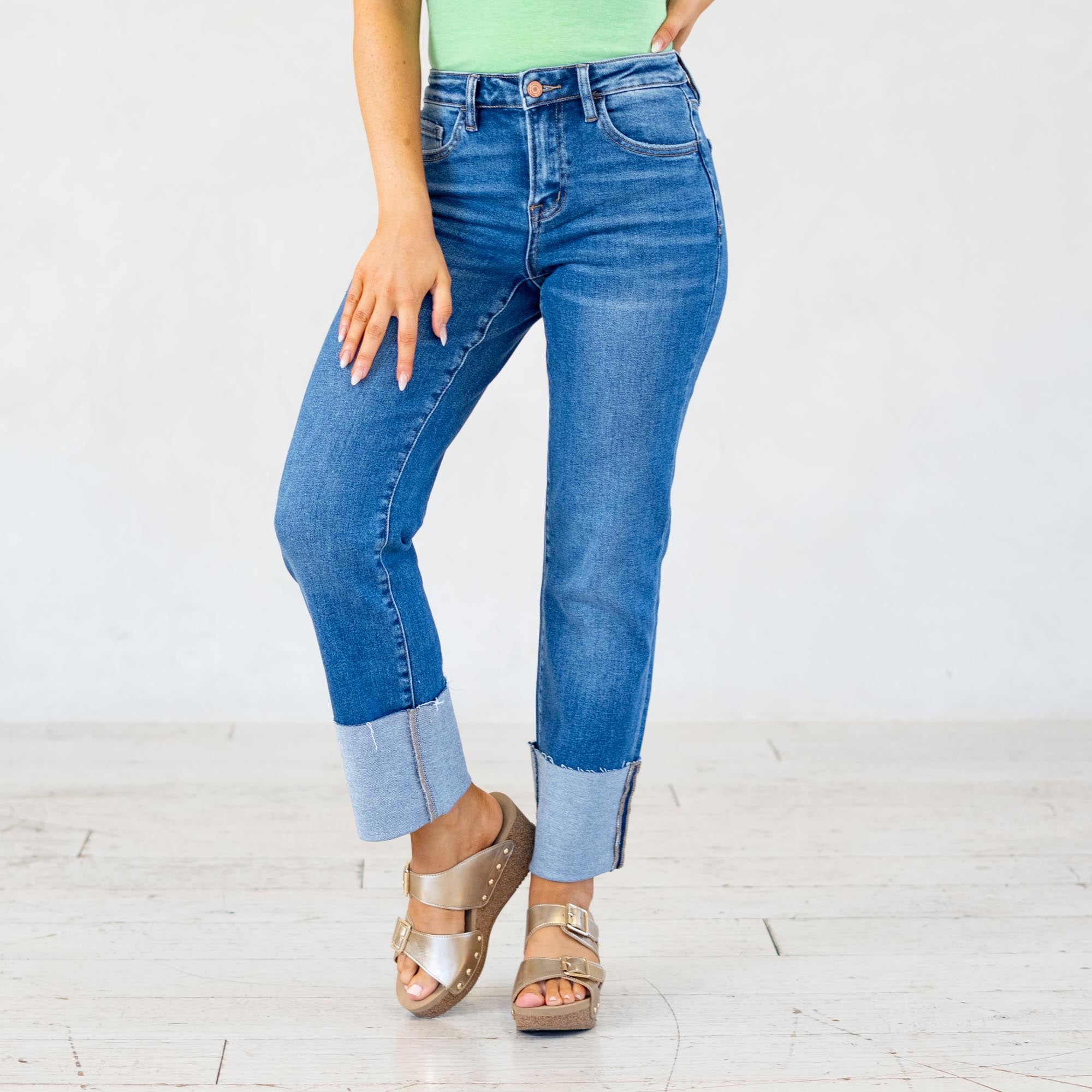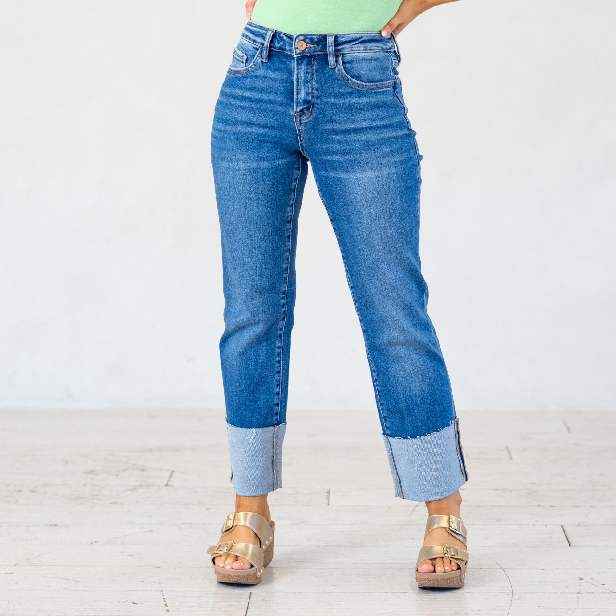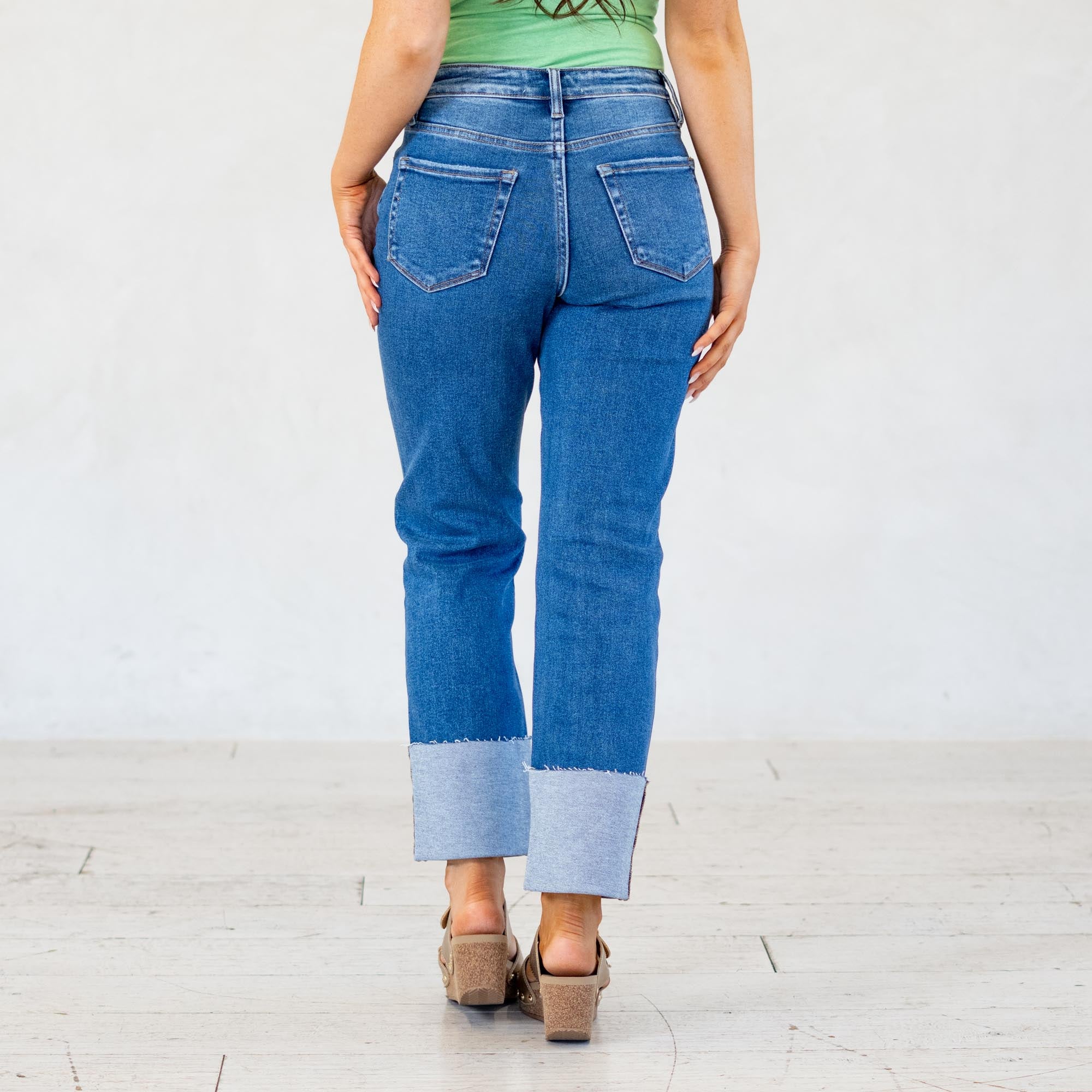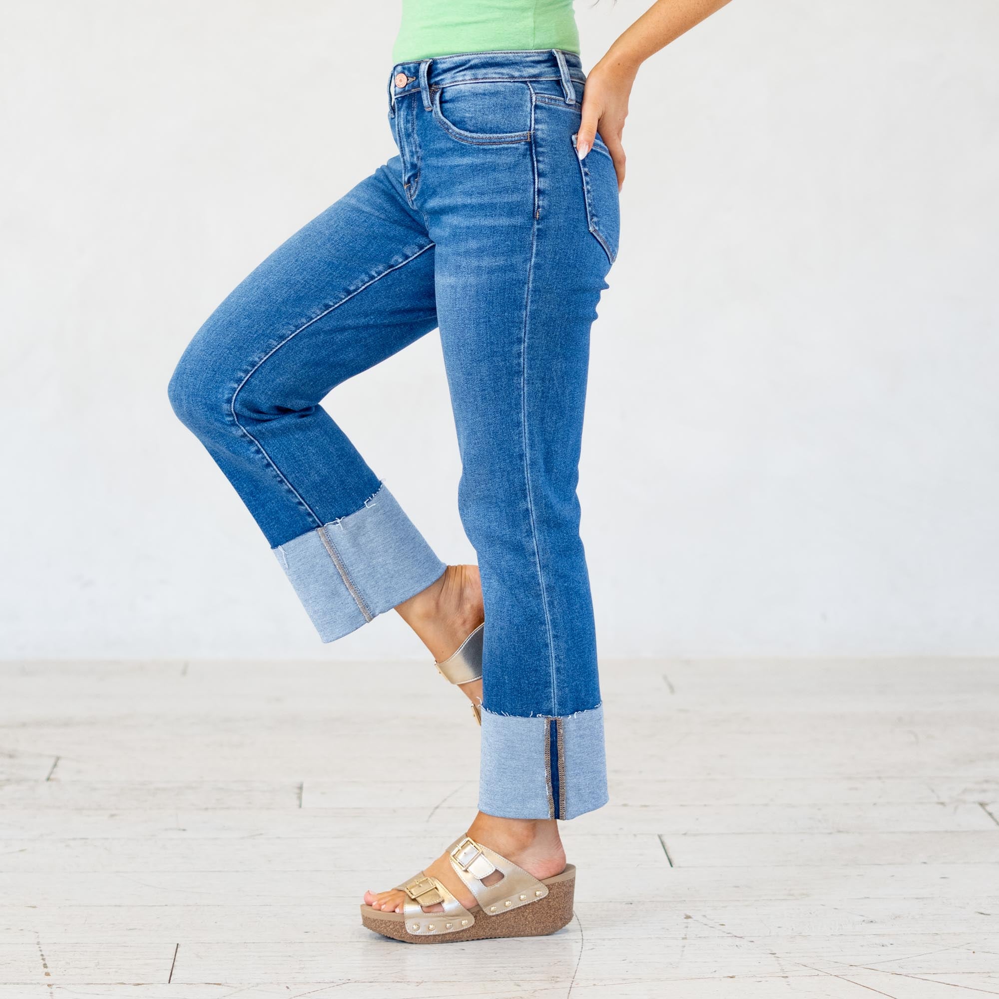 VERVET High Rise Medium Dark Cuffed Crop Straight Jeans