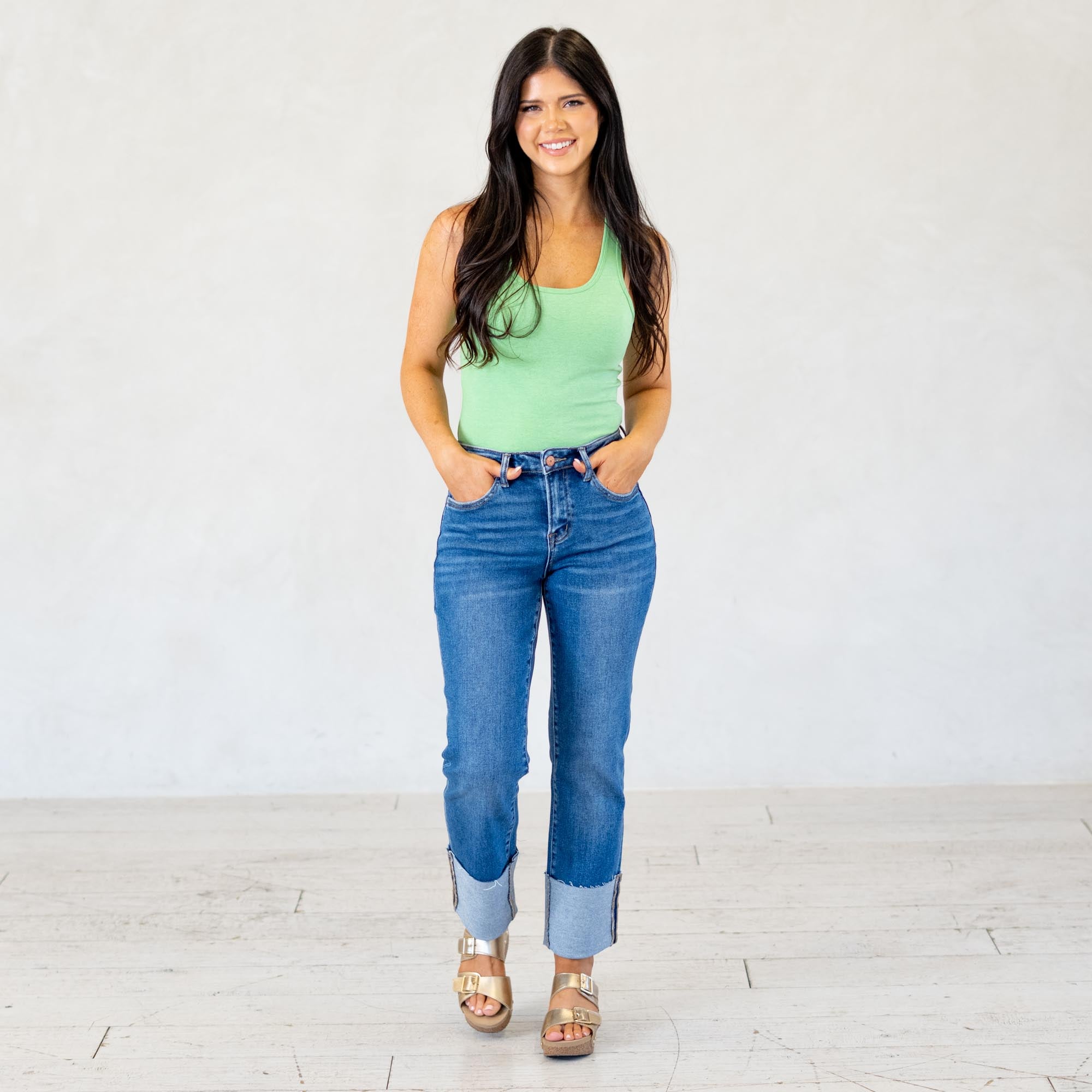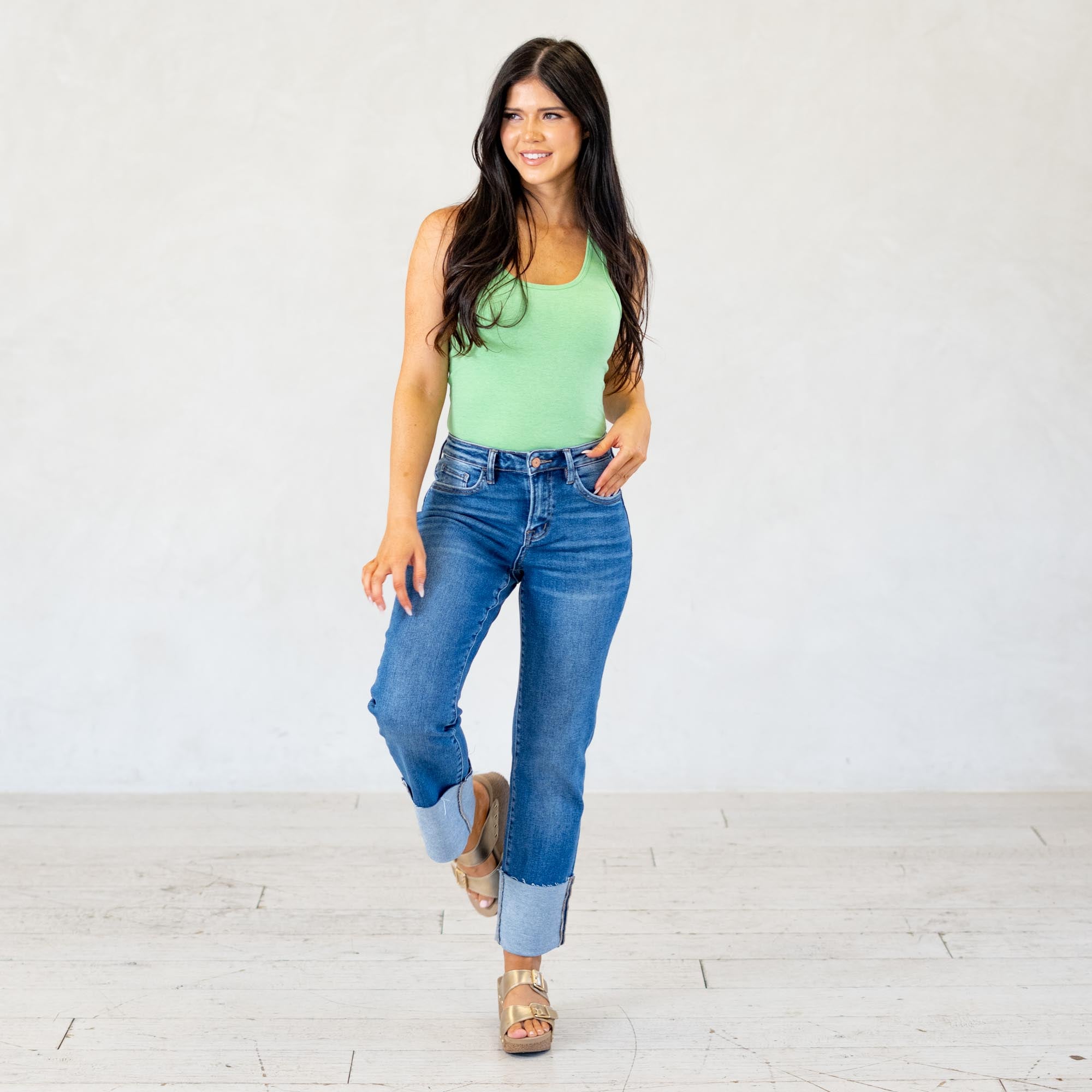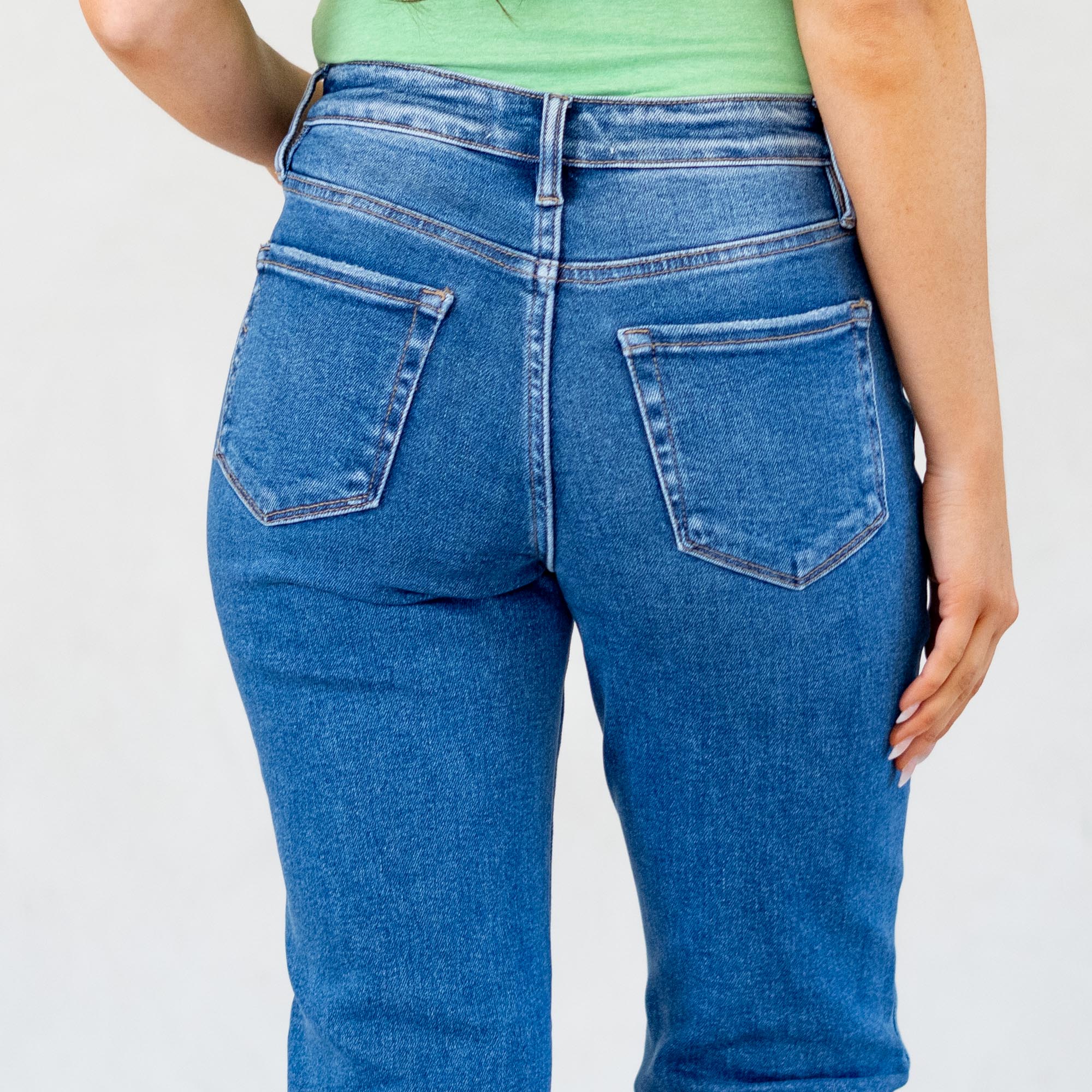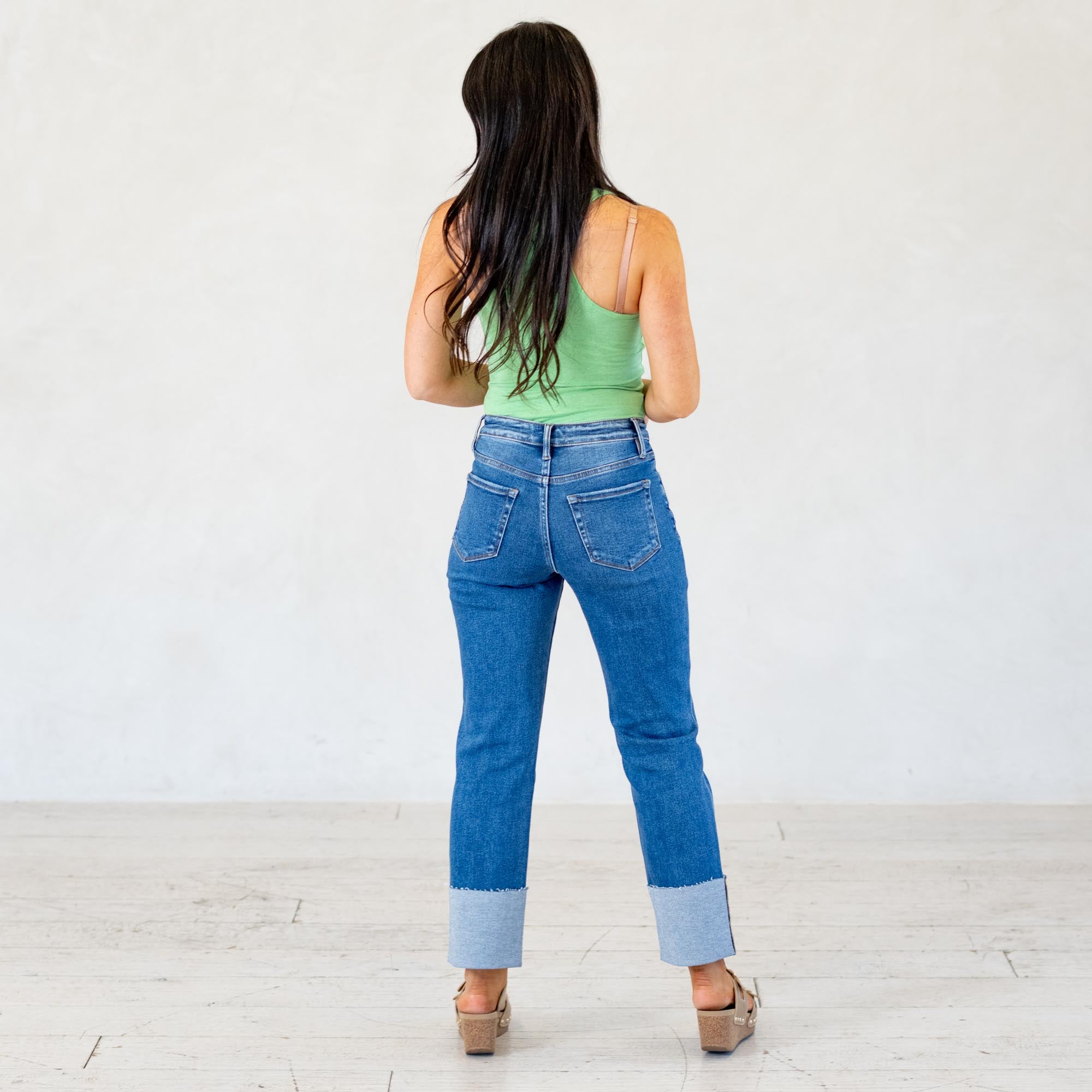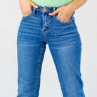 VERVET High Rise Medium Dark Cuffed Crop Straight Jeans