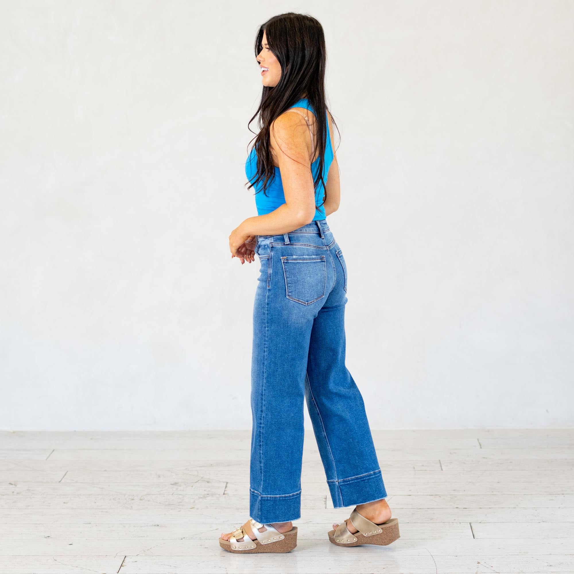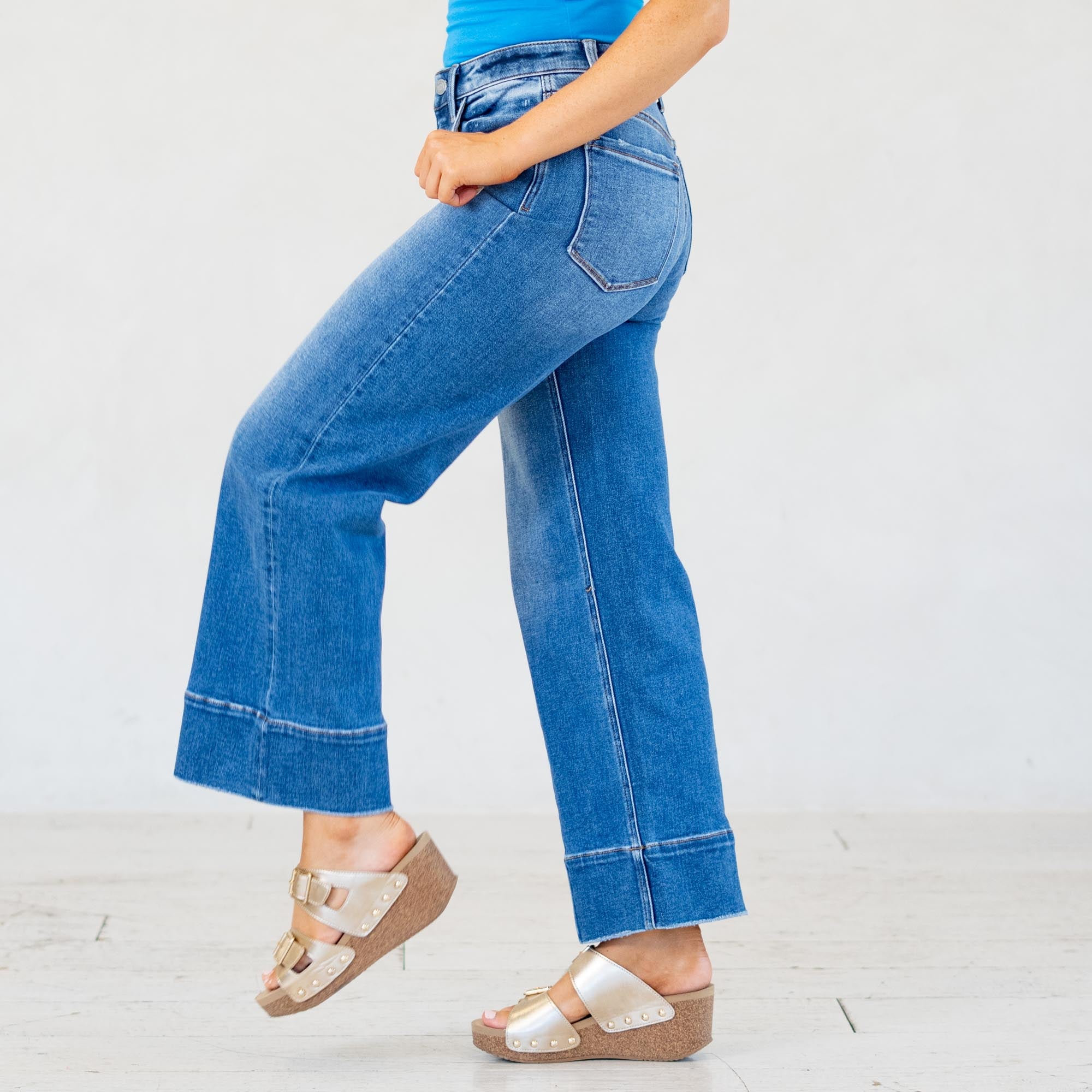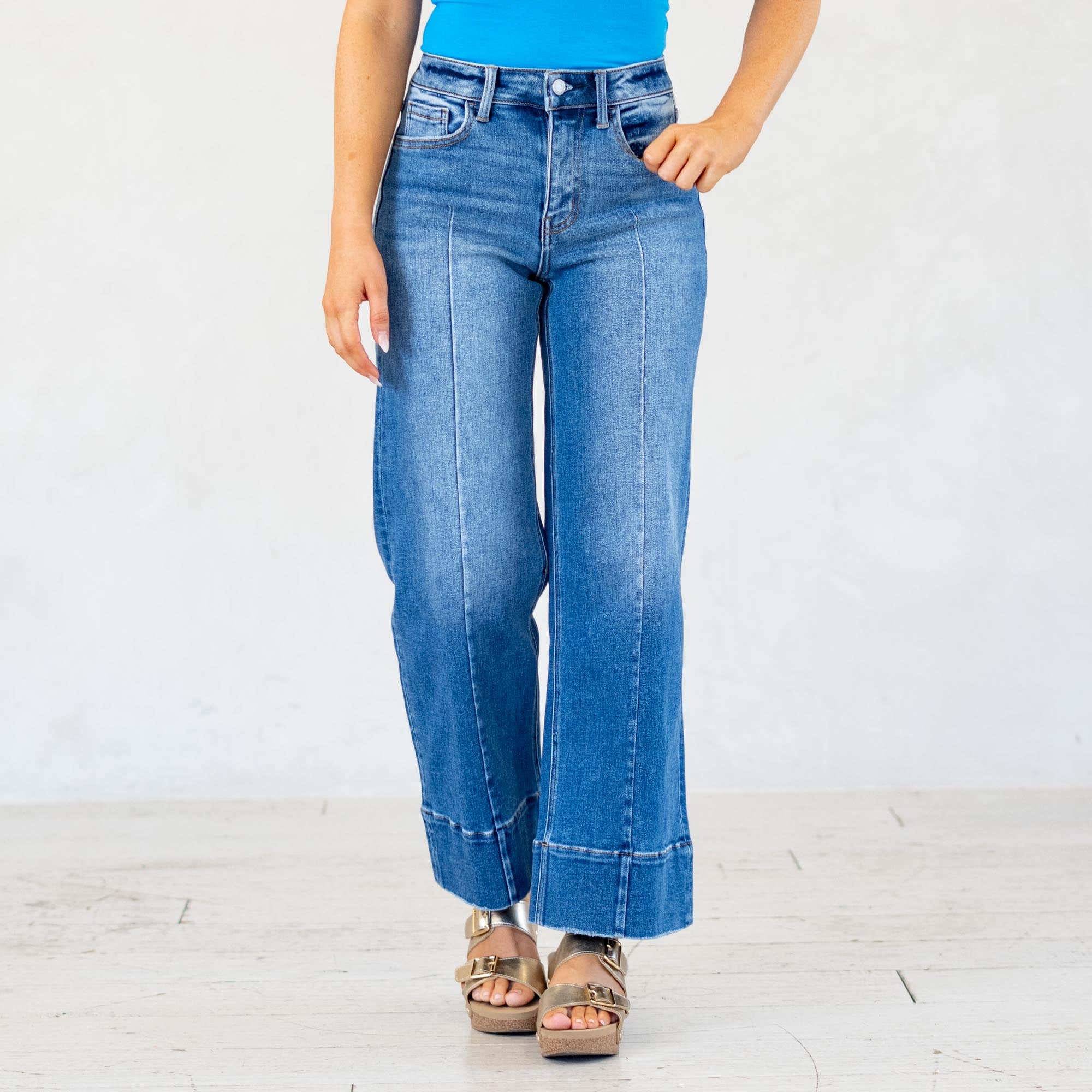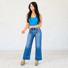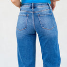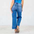 VERVET Golden Aura High Rise Trouser Hem Pin Tuck Ankle Wide Jeans Dark Blue