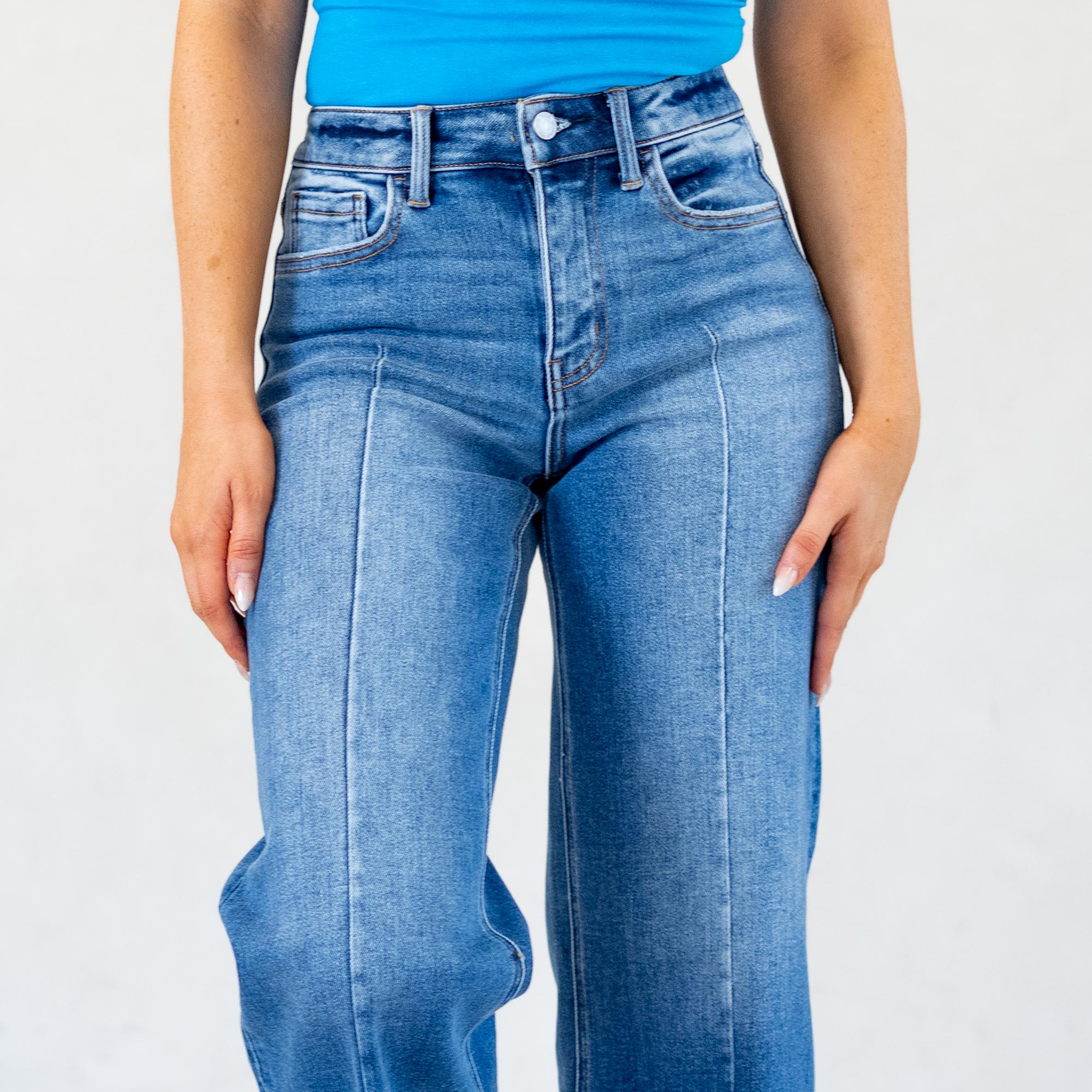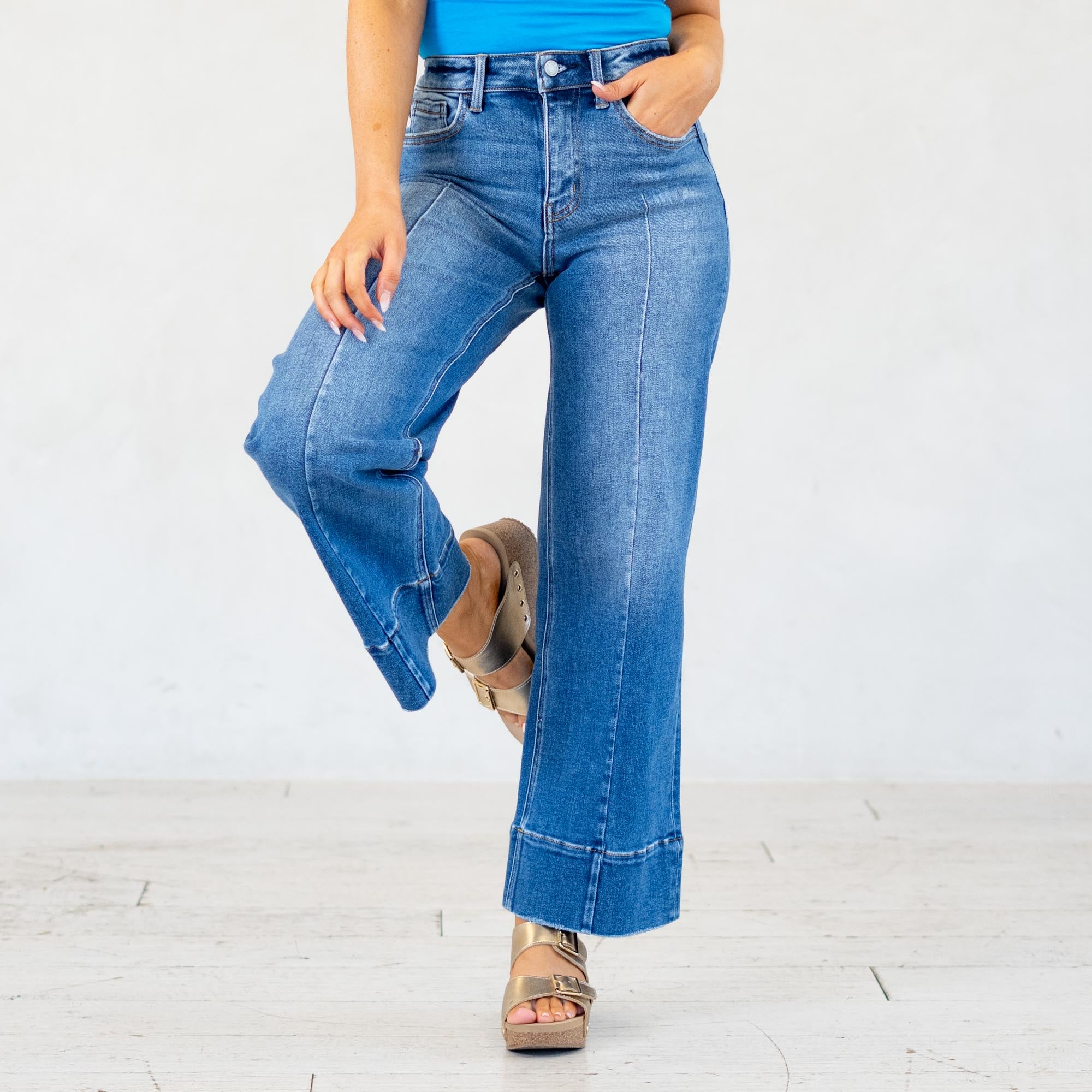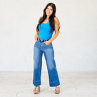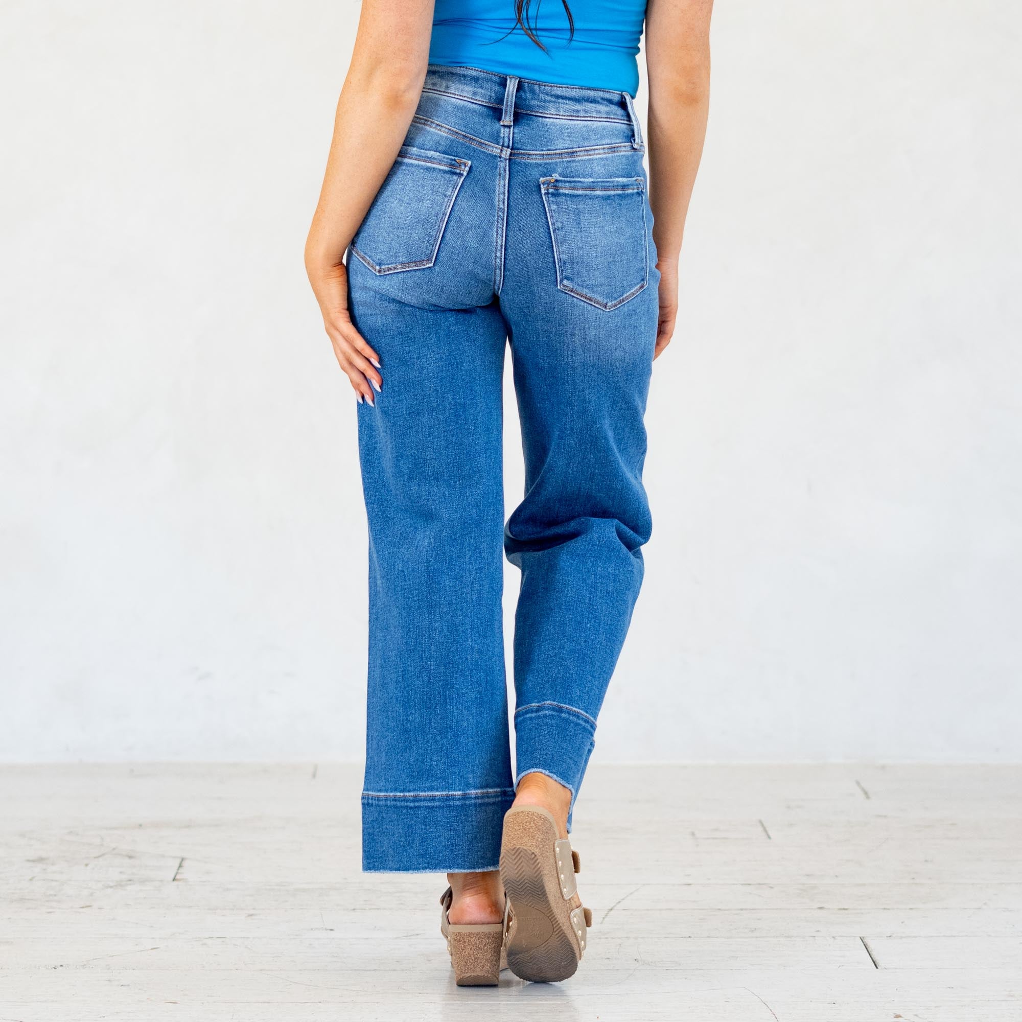 VERVET Golden Aura High Rise Trouser Hem Pin Tuck Ankle Wide Jeans Dark Blue