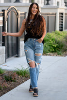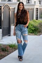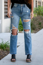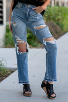 The High Rise Straight jeans boast a classic silhouette with a comfortable 11" rise and 30" inseam (size 3). Made from 100% cotton, these jeans offer a rigid feel with Stretchiness Level #1. The distressed detailing adds a trendy and worn-in look, making them a timeless addition to your wardrobe that effortlessly combines style and comfort.