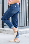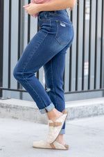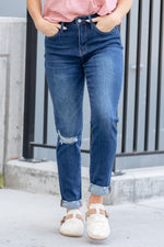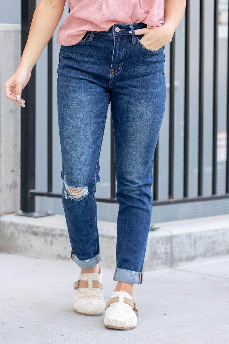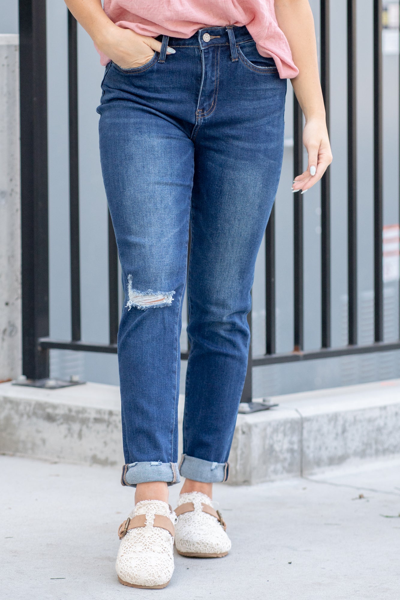 These comfortable stretchy mom jeans have a slouchy fit, a distressed knee, cuffed hem and a high waist in a dark blue wash.