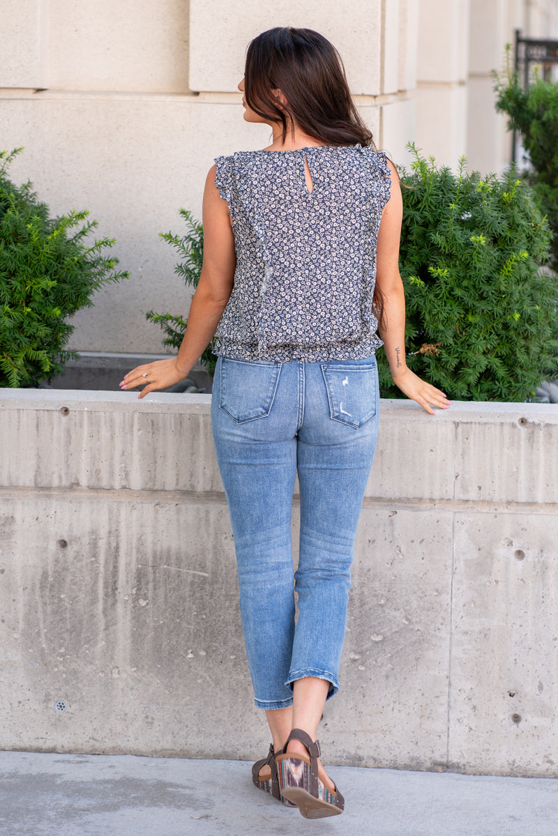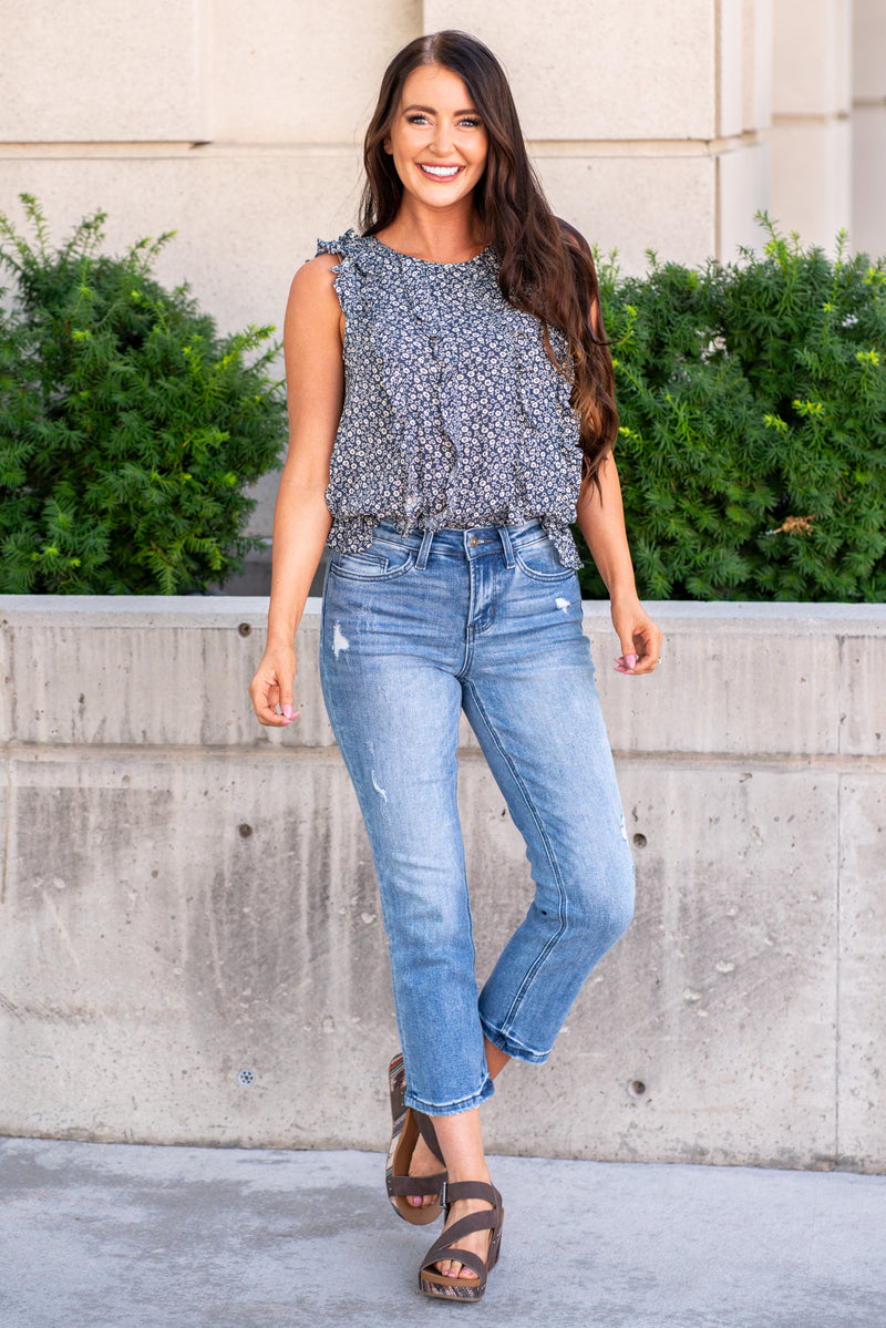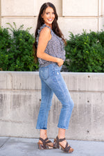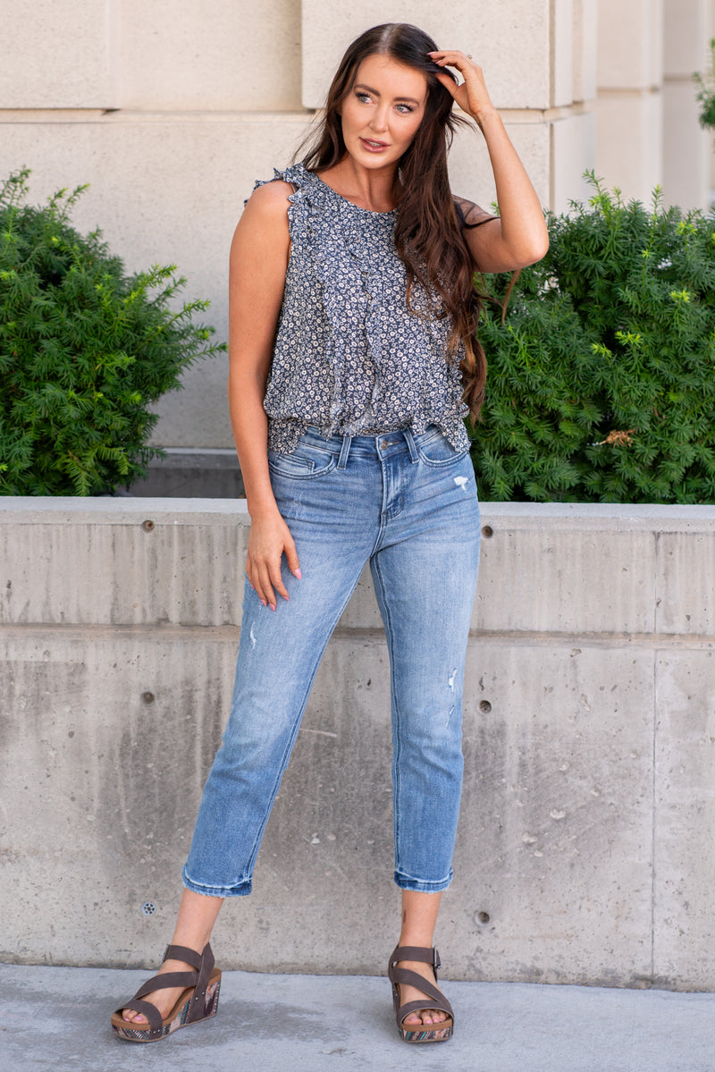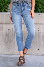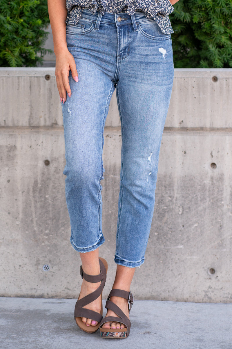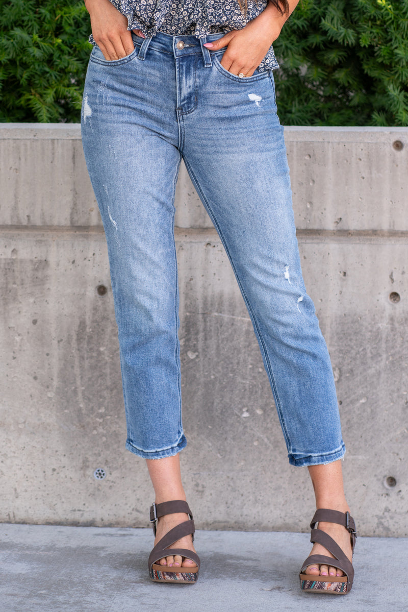 These high waisted crop straight leg jeans have a comfortable stretch with slim legs and slight distressed detail with the classic 5 pocket design.