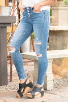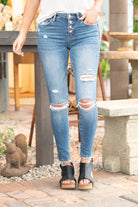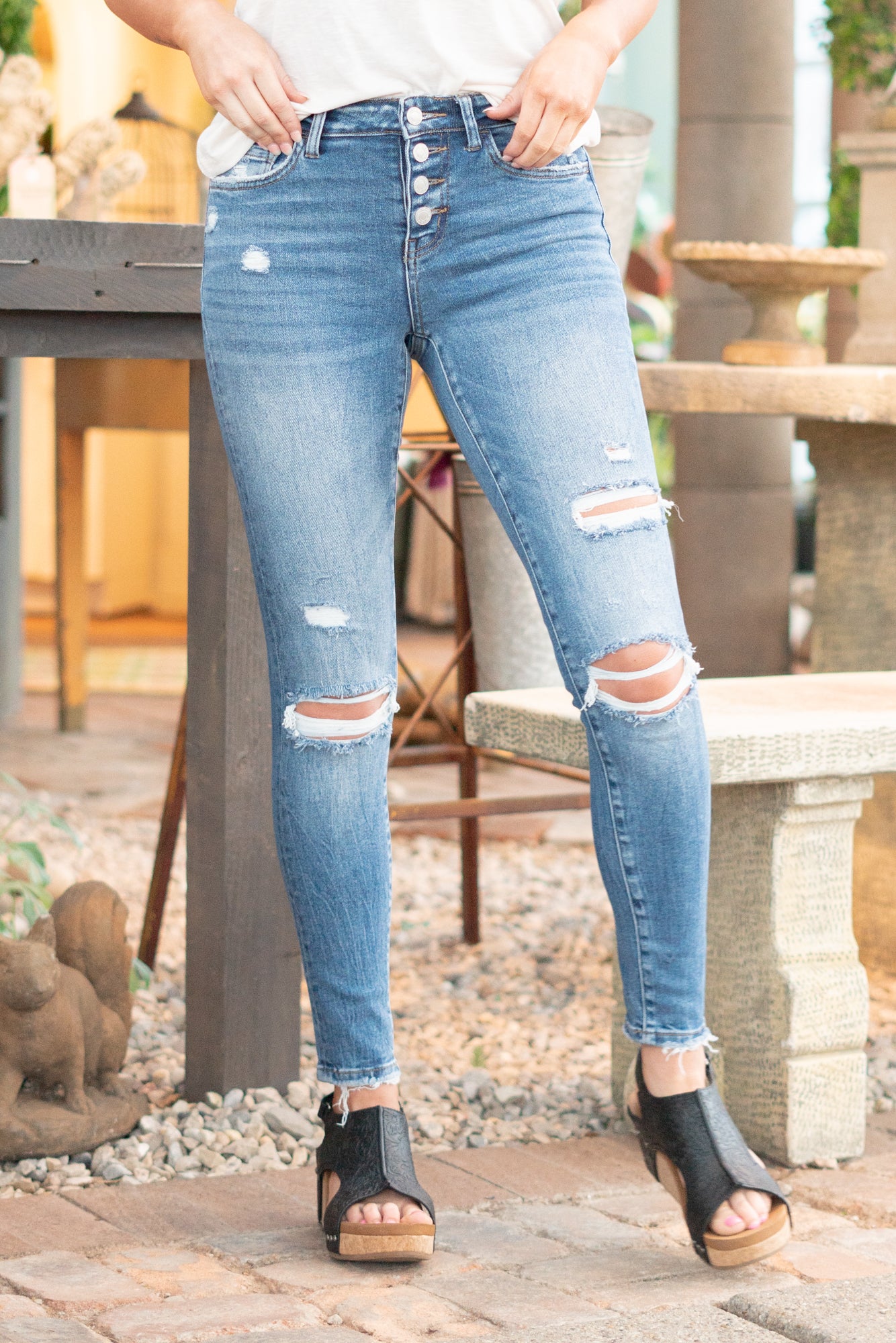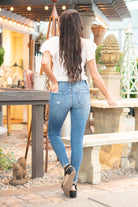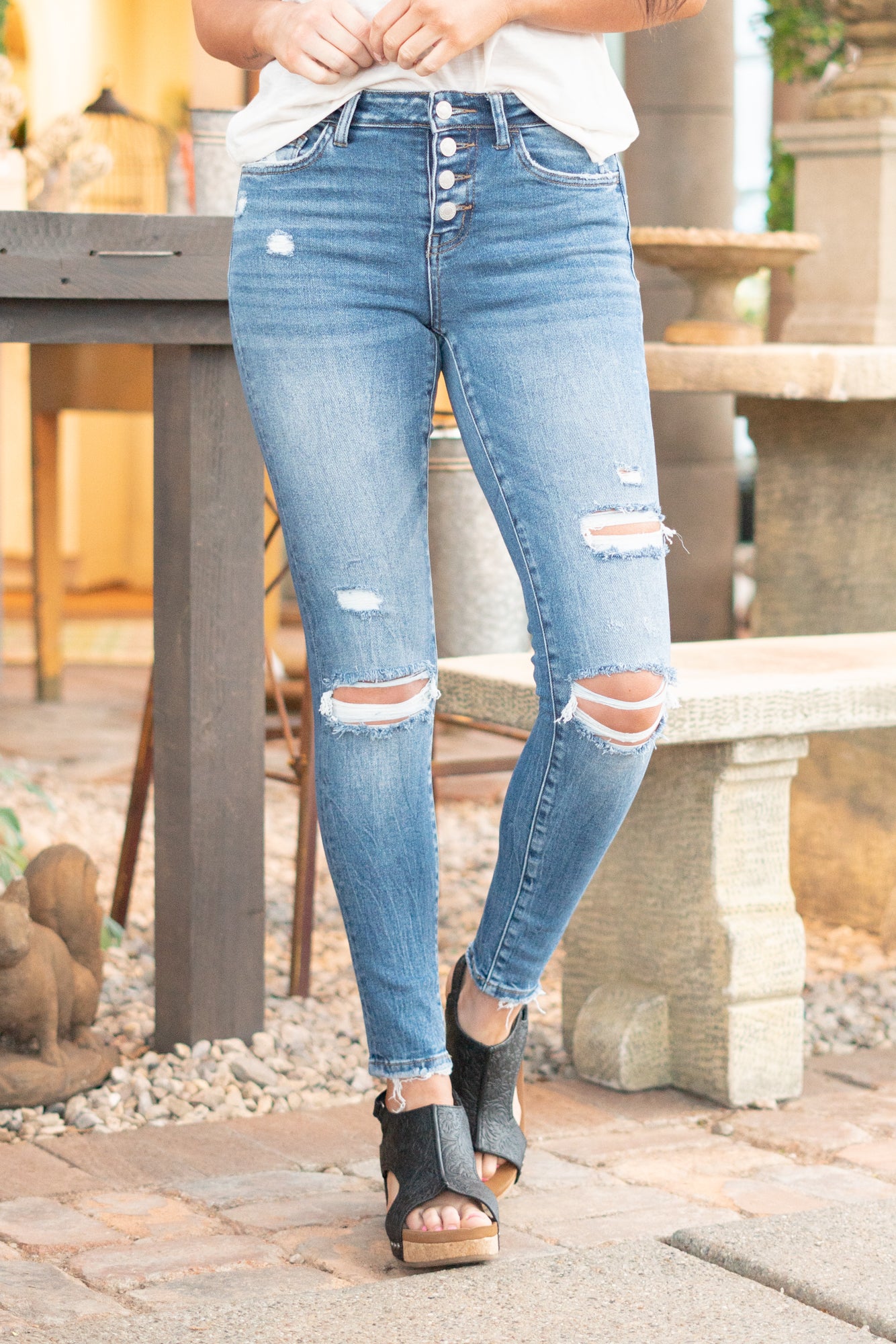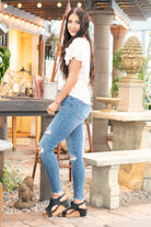 Alexis wears a size 25 in jeans, a small in tops, and 7 in shoes. She is wearing size 25 in these jeans.