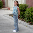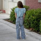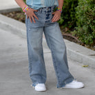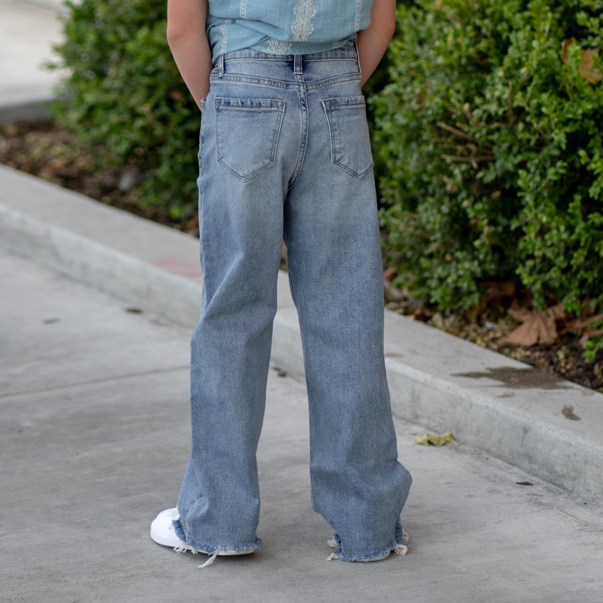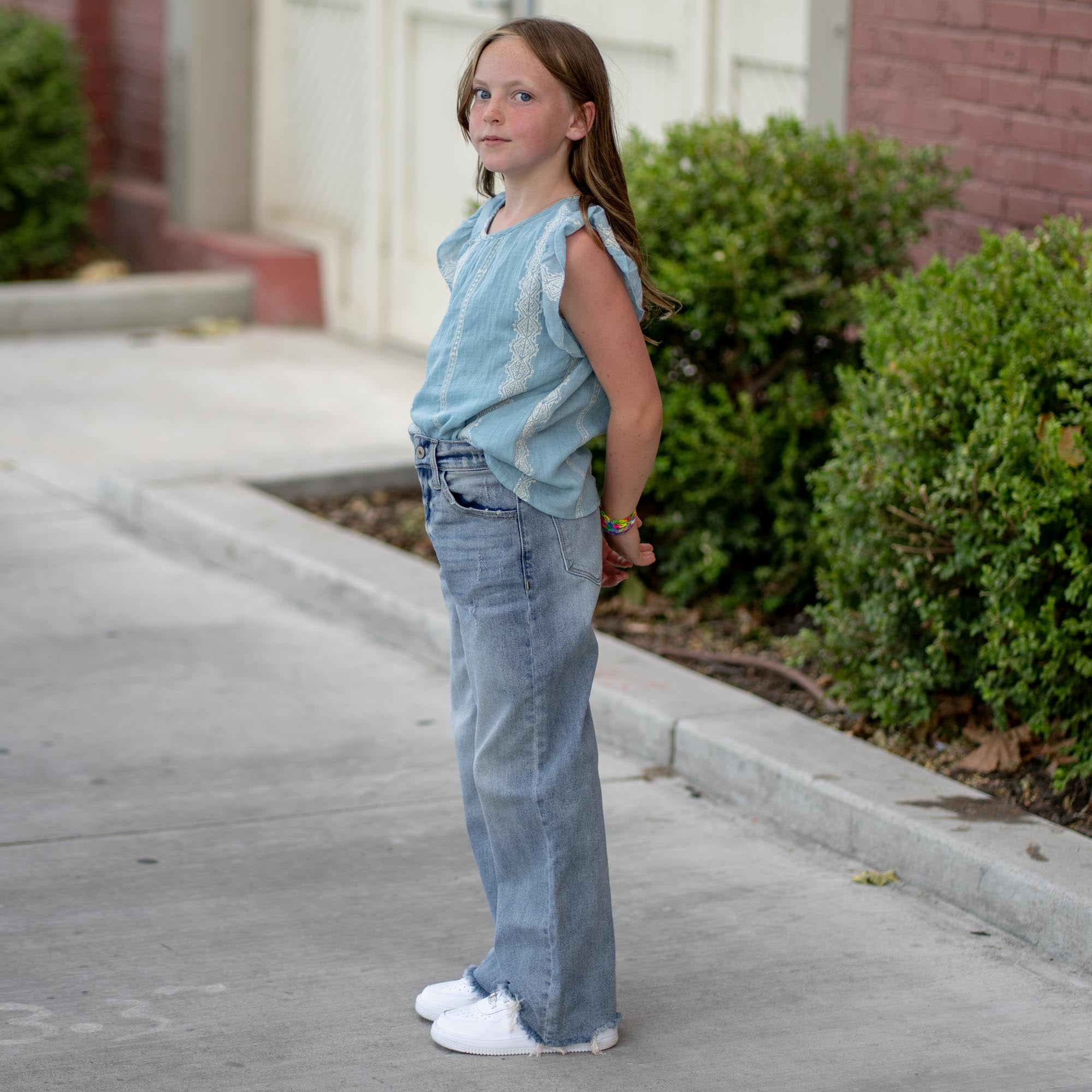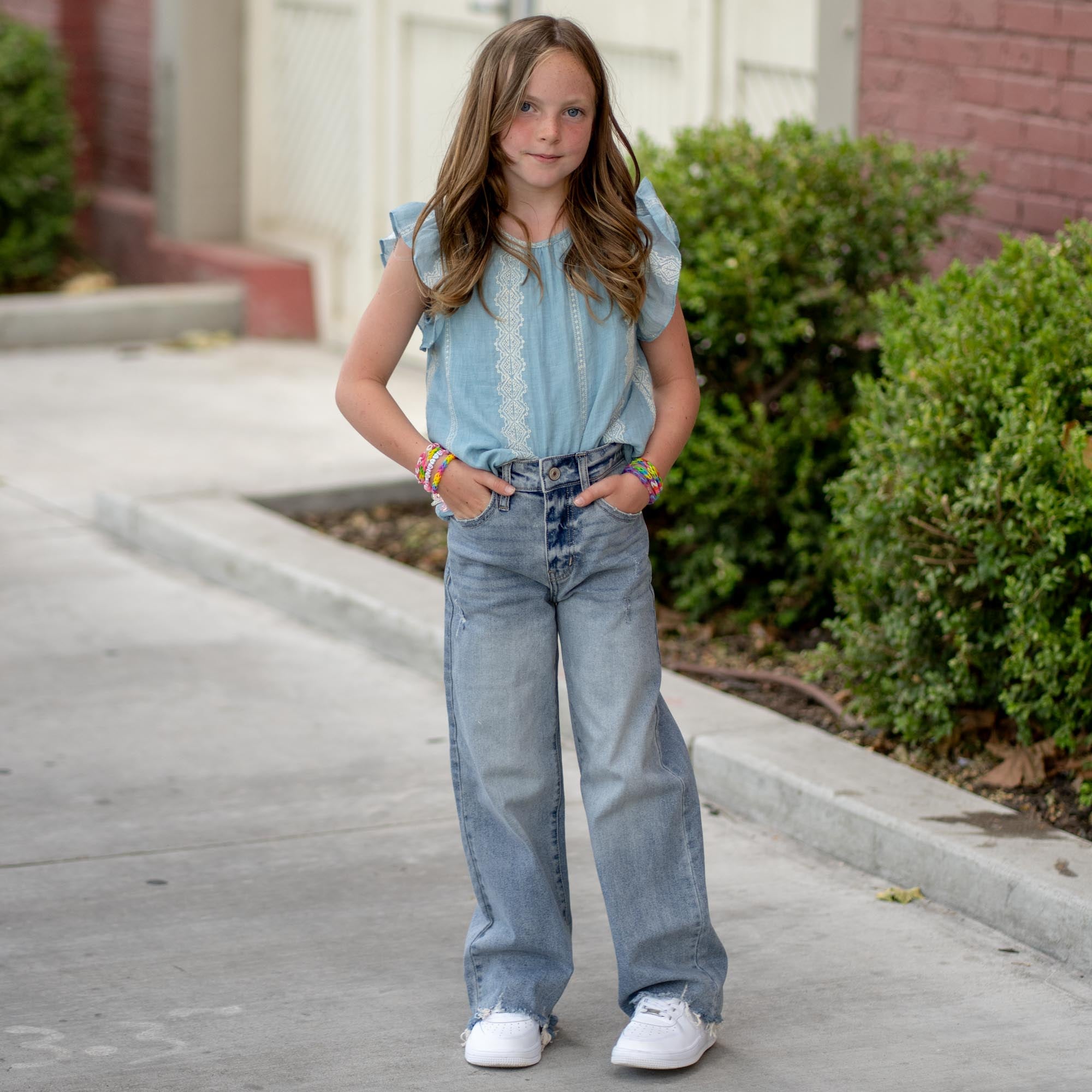 Our Bee High Rise Slim Wide Leg Jeans for kids are designed for comfort and effortless style. These light wash jeans feature subtle whiskering and a clean hem detail, offering a trendy yet classic look. With a traditional 5-pocket design, single-button closure, and zip fly, they’re the perfect everyday denim for your little trendsetter.