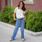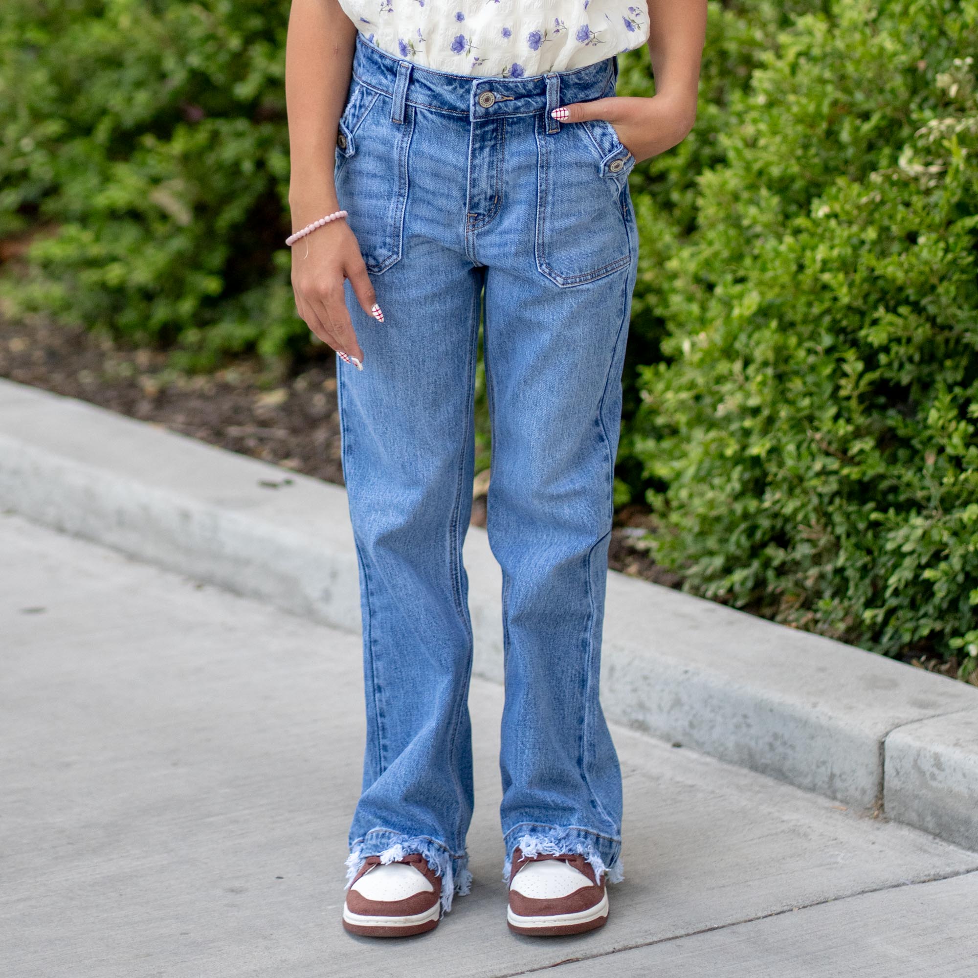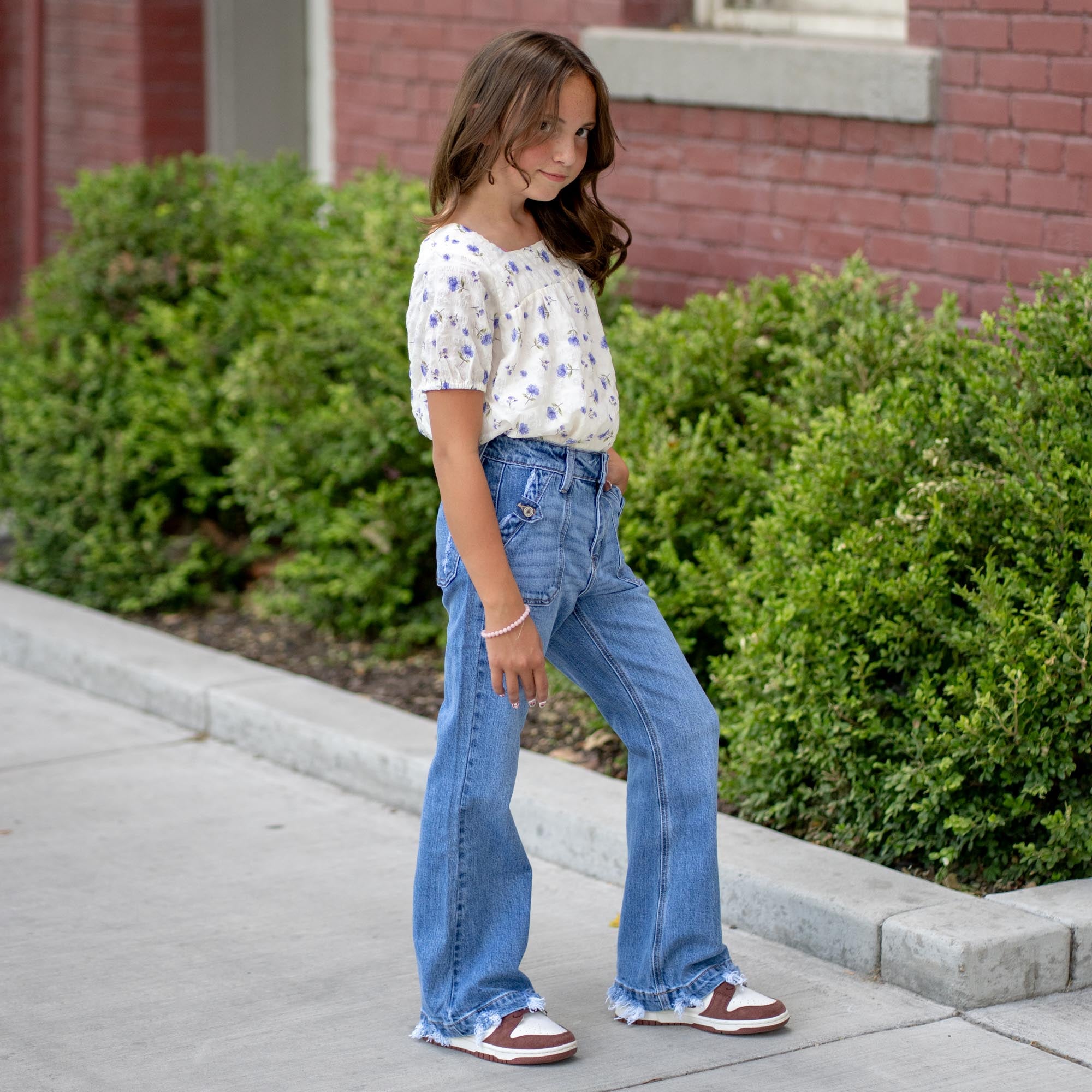 Meet Sherri — our newest go-to jean for your trendsetting kiddo! These high rise wide leg flare jeans come in a versatile medium wash and are made with comfort in mind for all-day wear. Finished with a 1" hem, porkchop pockets, a single button closure, and zip fly, the Sherri Jeans bring retro vibes with a modern fit.