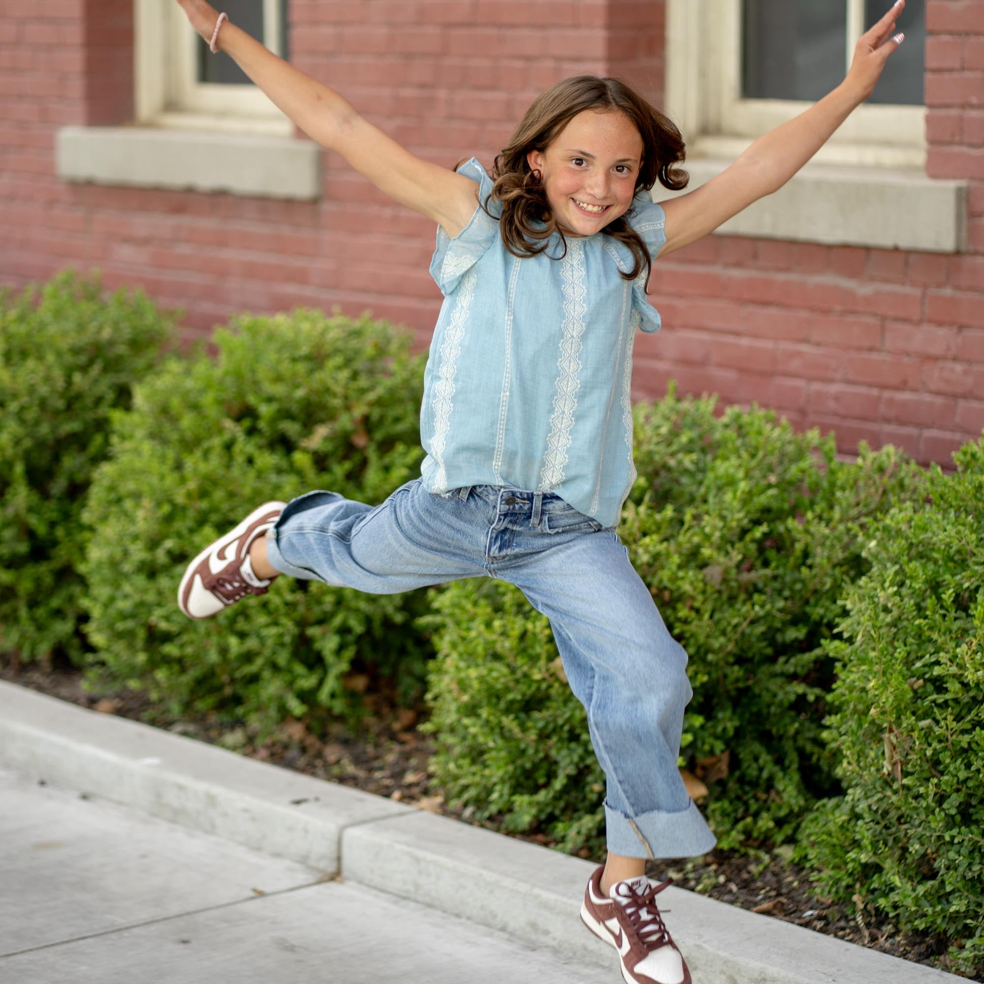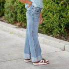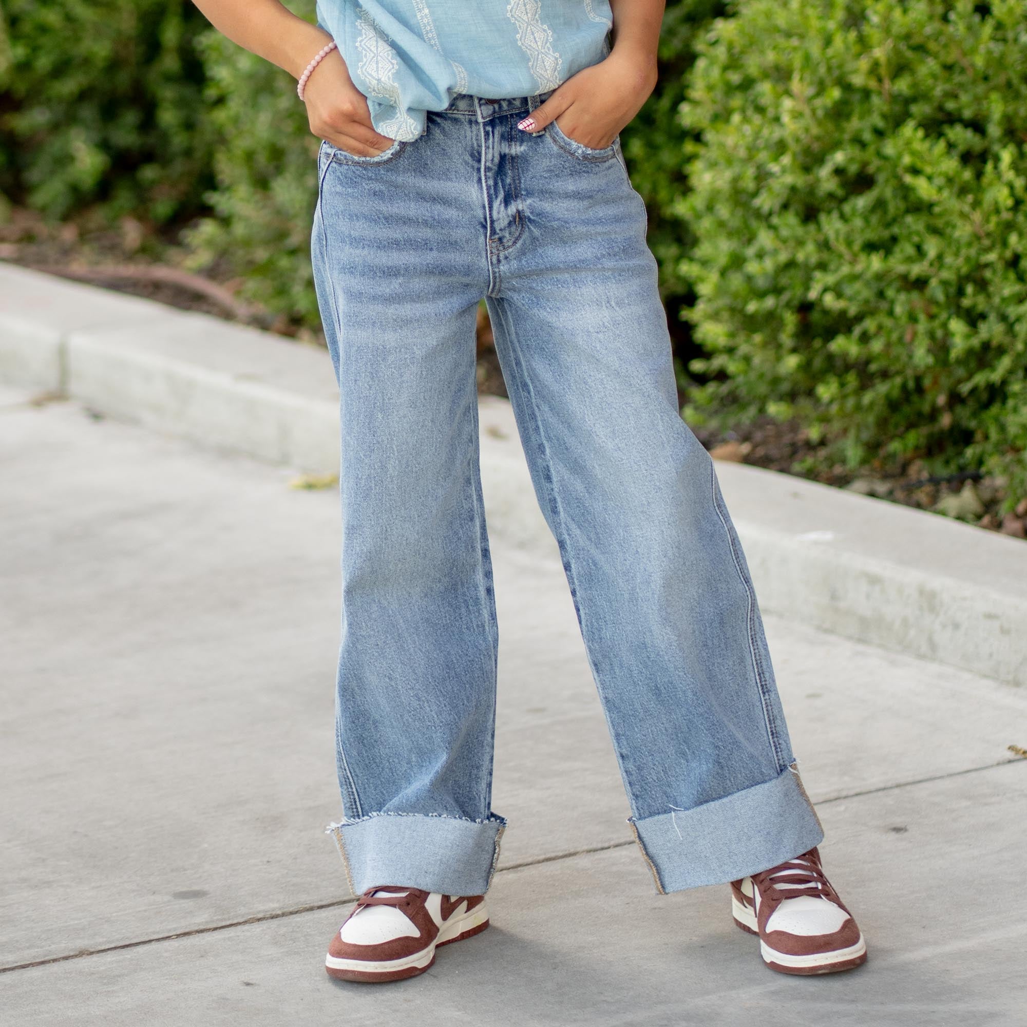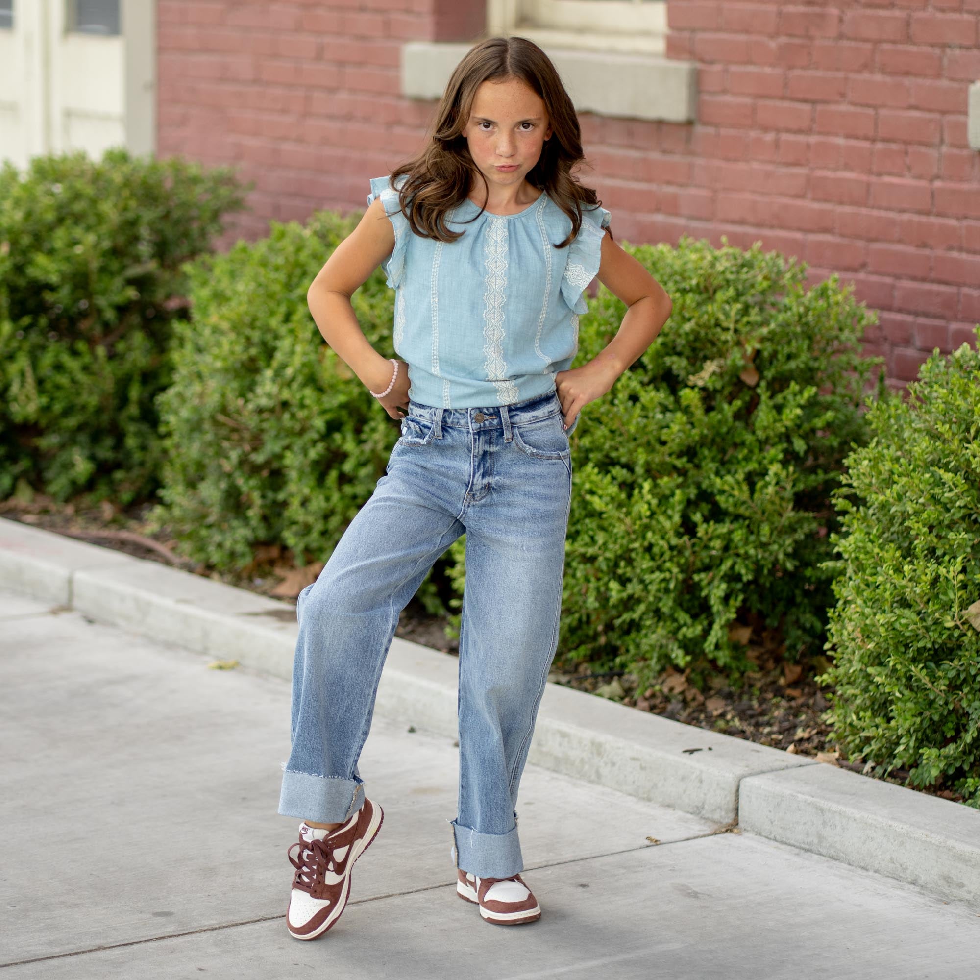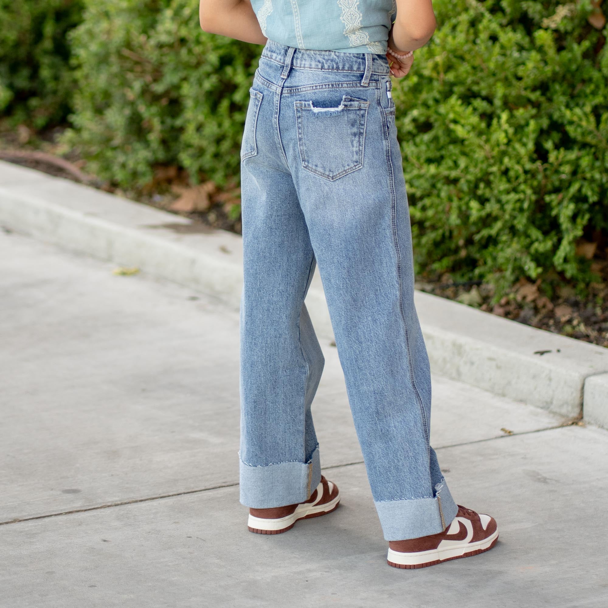 Give your mini fashionista a statement look with the Danielle Kids' High Rise Wide Leg Jeans. These comfy-cool jeans come in a medium wash and feature a 1.5" elastic waistband for the perfect fit. With an open side seam and wide-leg silhouette, they offer freedom to move and play in style. Finished with a cuffed hem and crafted with comfort stretch denim, they’re both cute and functional for everyday wear.